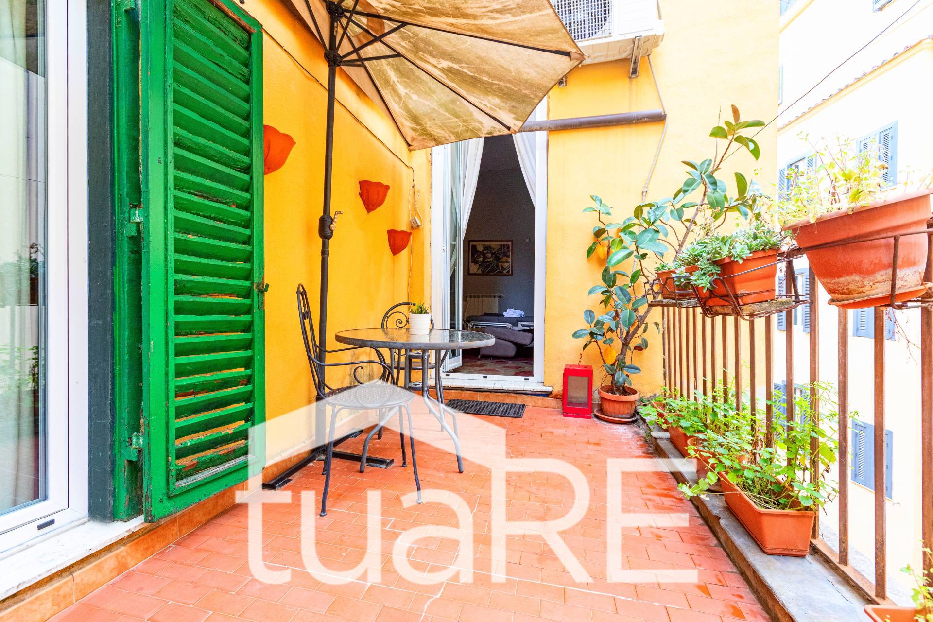 L'appartamento, posto al penultimo piano, gode di un terrazzo a livello e di soffitti alti con travi a vista.