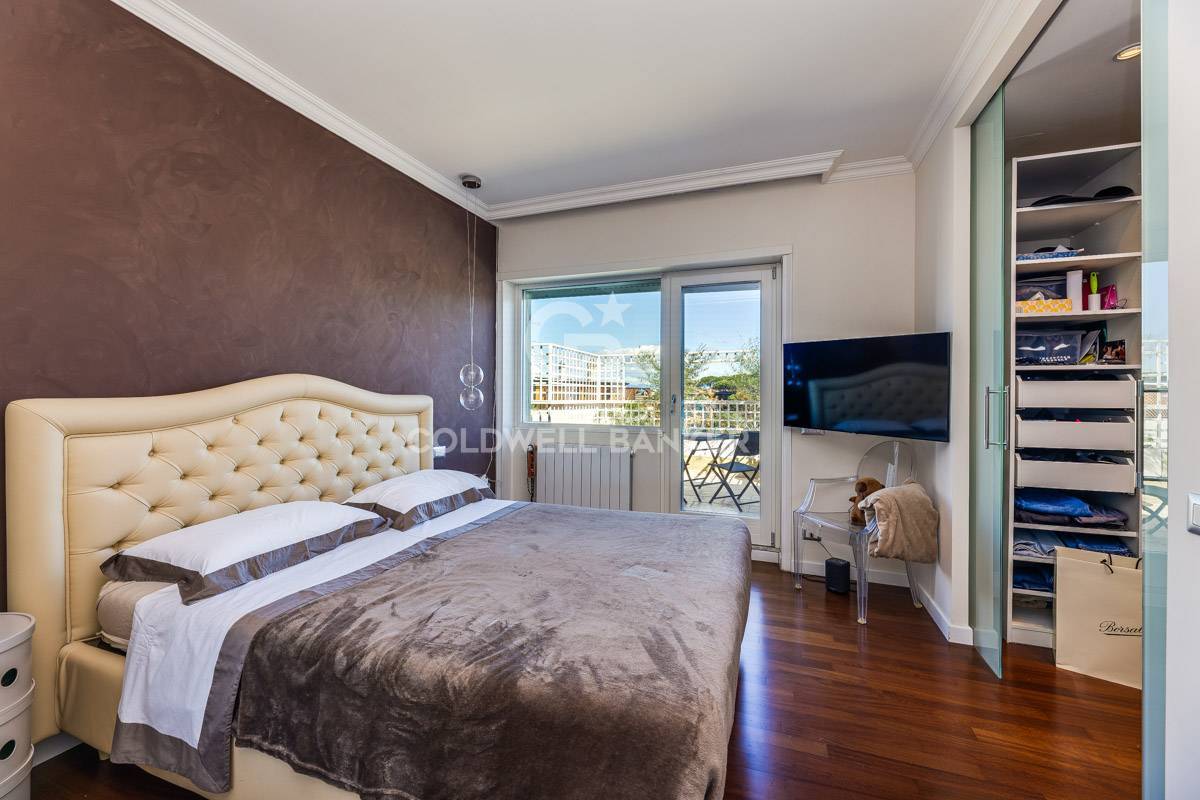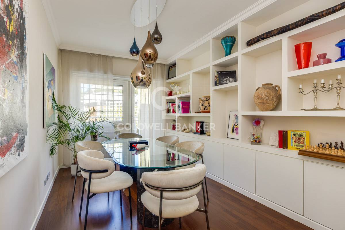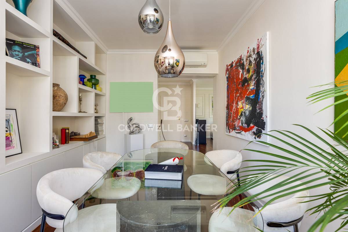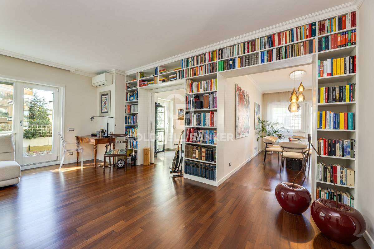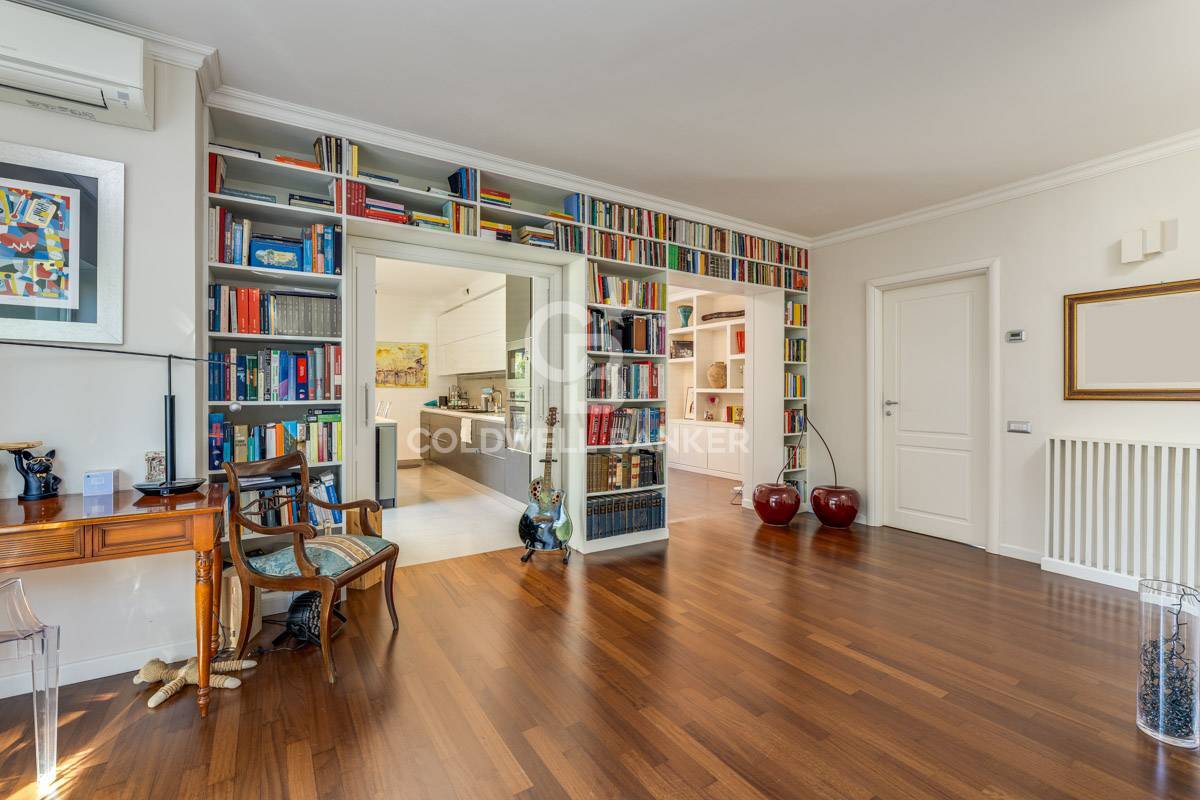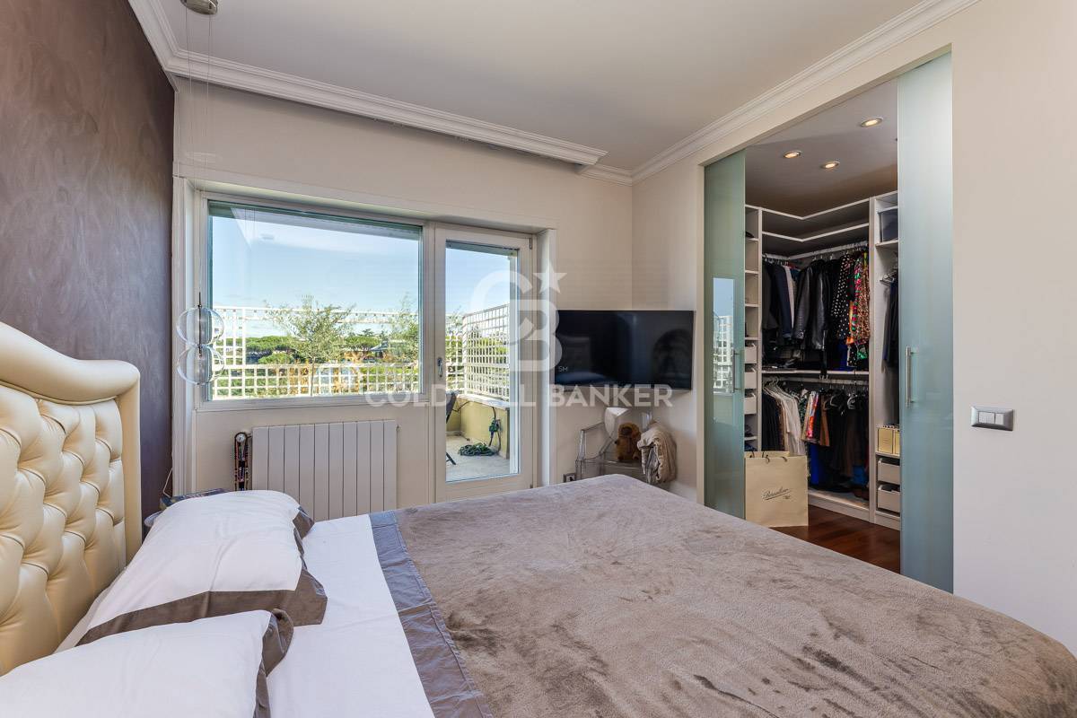 VIALE CORTINA D'AMPEZZO - ATTICO RISTRUTTURATO ALL'INTERNO DI UN COMPRENSORIO CON GUARDIANIA H24 - ? 830.000 All'interno di un elegante e silenzioso comprensorio in Viale Cortina d'Ampezzo, con servizio di portineria H24 e splendidi giardini condominiali, proponiamo la vendita di un attico posto al quarto piano, tripla esposizione, composto da ingresso, salone, cucina abitabile su misura completa dell'arredo e comprensiva anche di cantinetta per i vini, una prima camera da letto adibita attualmente a sala da pranzo con libreria su misura, una camera da letto padronale con una comodissima cabina armadio, una ulteriore camera da letto adibita attualmente a sala hobby, doppi servizi (uno finestrato ed uno non finestrato), ripostiglio, tripli terrazzi per una superficie esterna complessiva di circa 60 mq. Completa la propriet un box auto singolo.