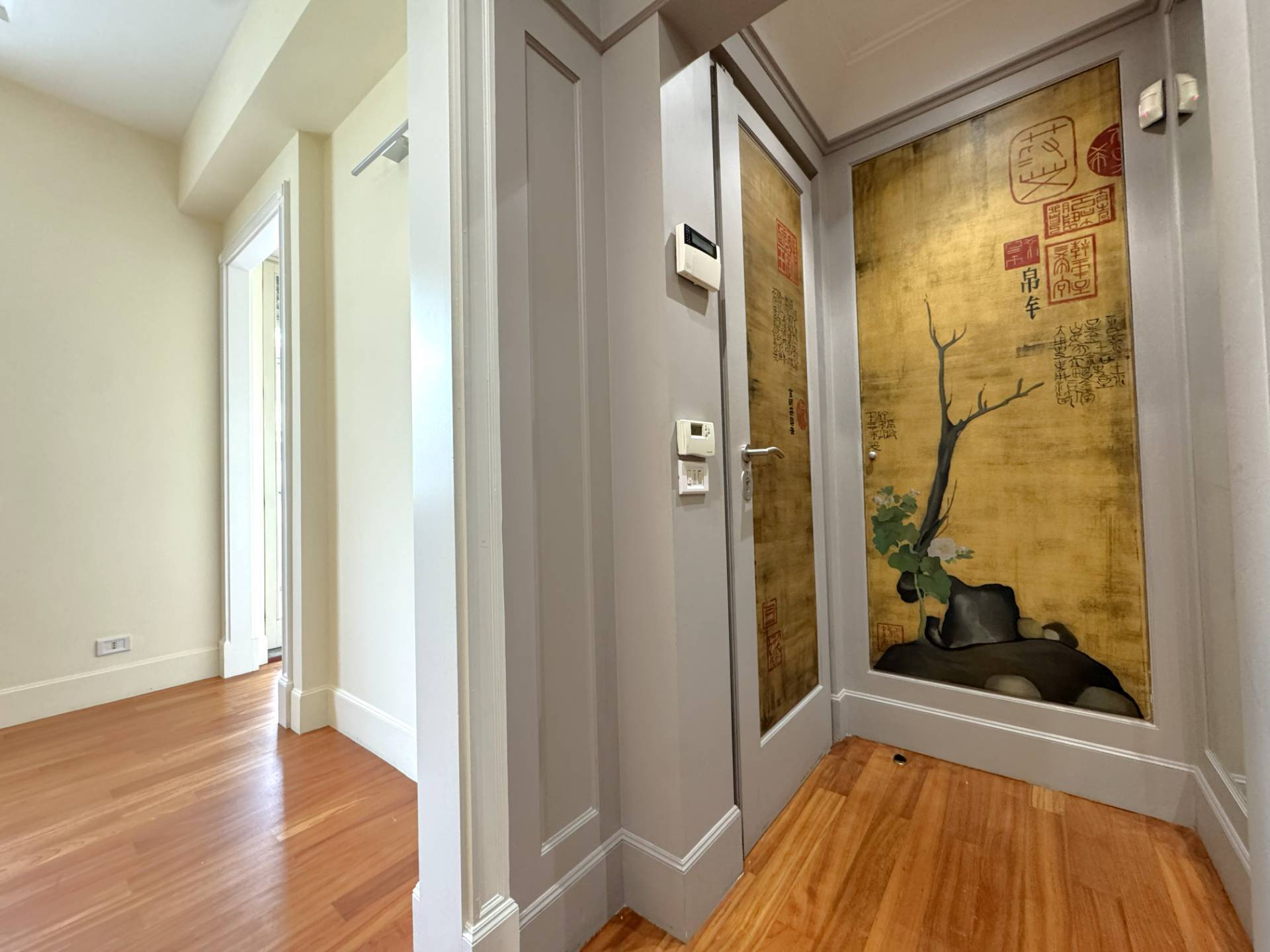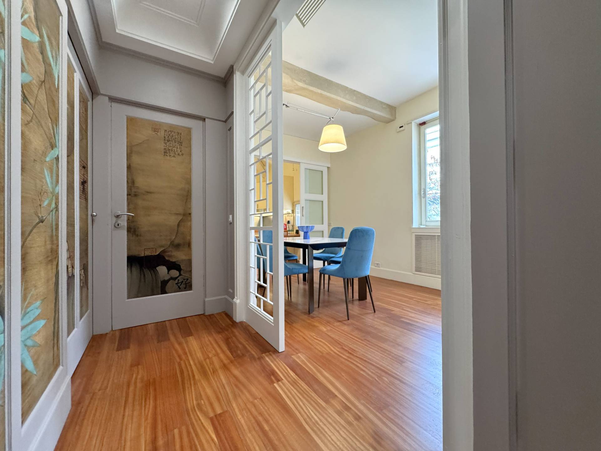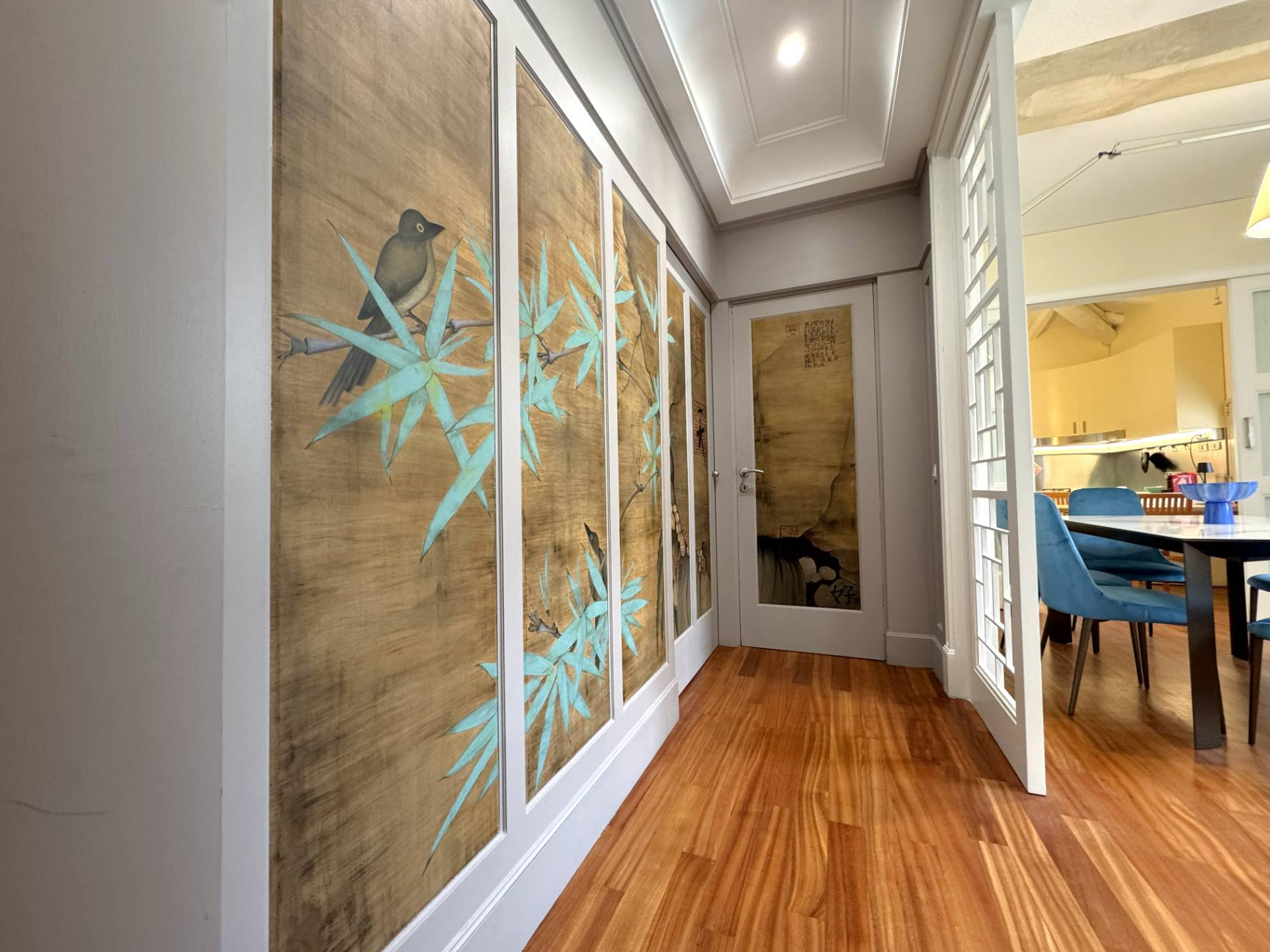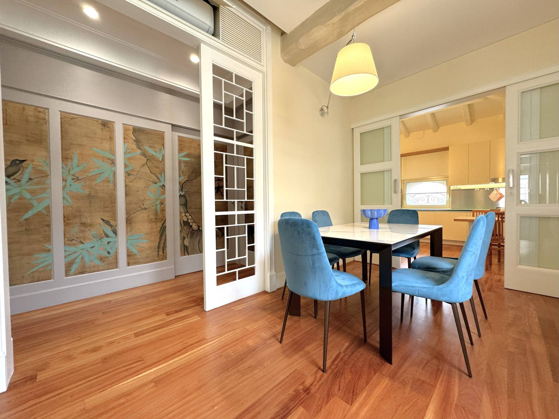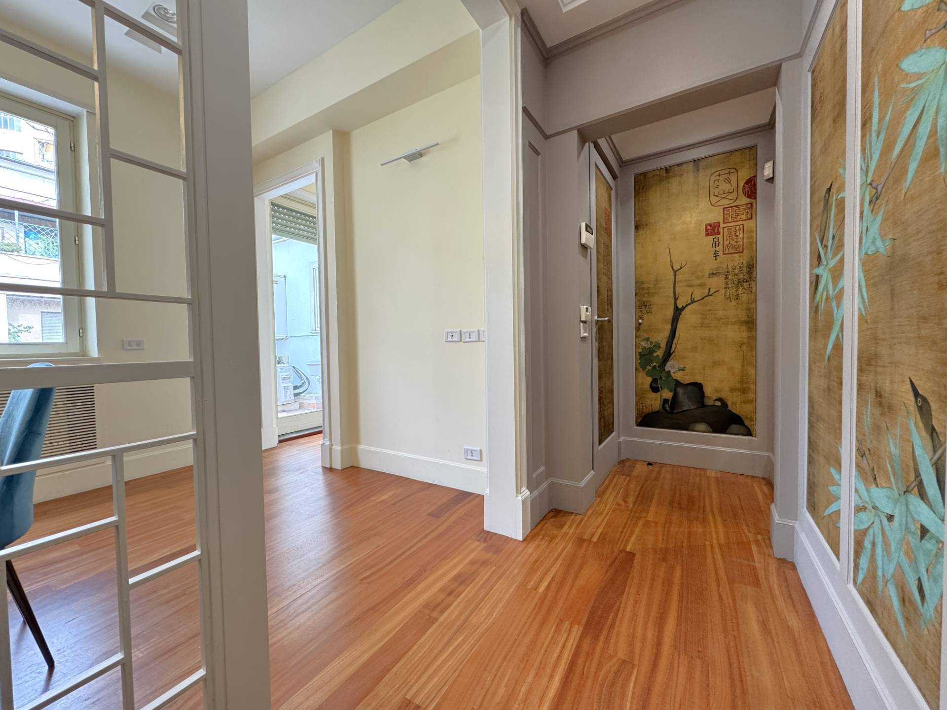 L'appartamento in ottime condizioni generali e vanta rifiniture e dotazioni di alto livello, quali pavimentazione in parquet, porte Bertolotto e artigianali, boiseries in stile orientale, infissi in alluminio e in legno, bagni rivestiti con mosaici e pietra, vari elementi d' arredo su misura.