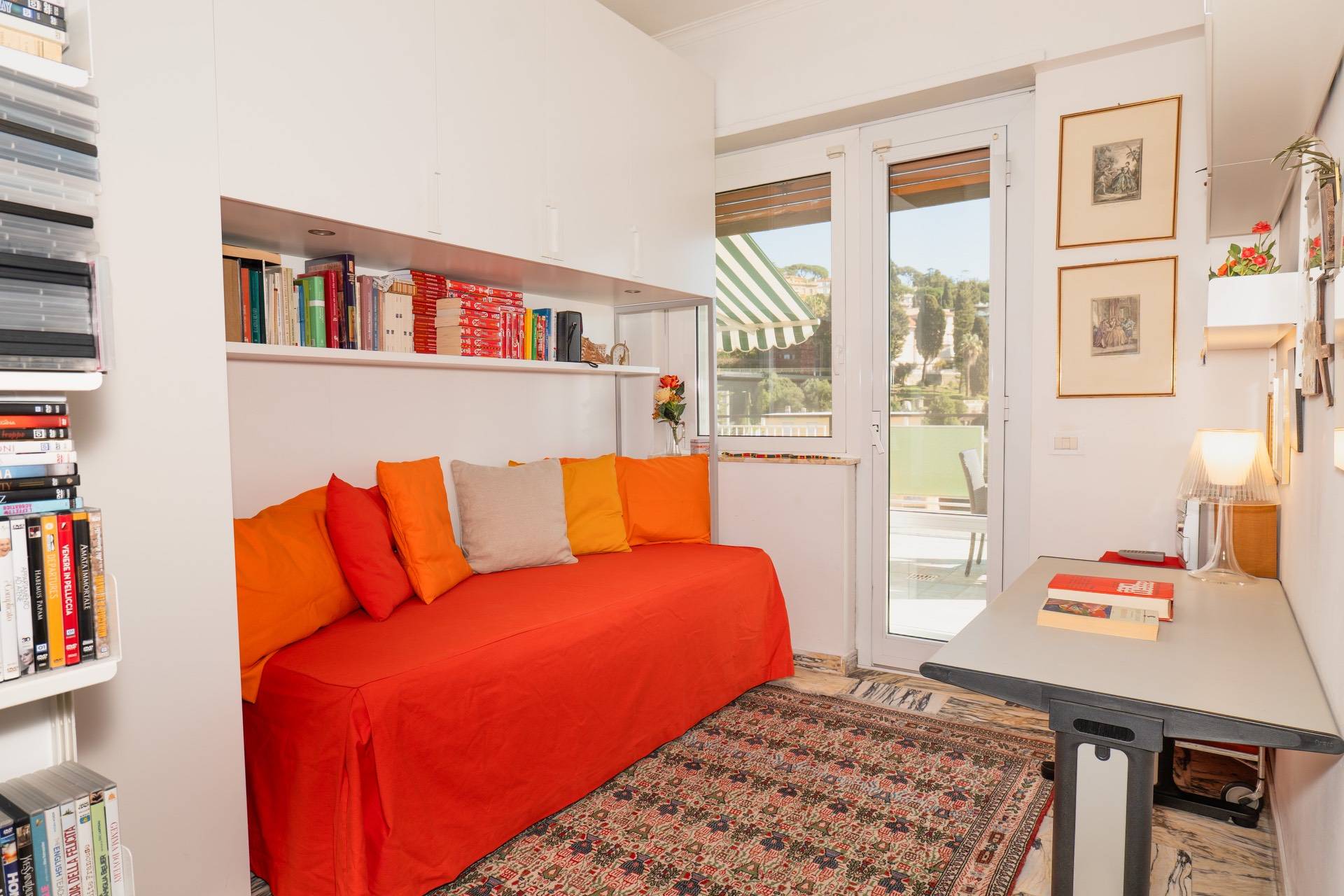 Lingresso conduce a un elegante salotto, luminoso e accogliente, affiancato da uno studio ideale per chi lavora da casa o desidera uno spazio riservato.