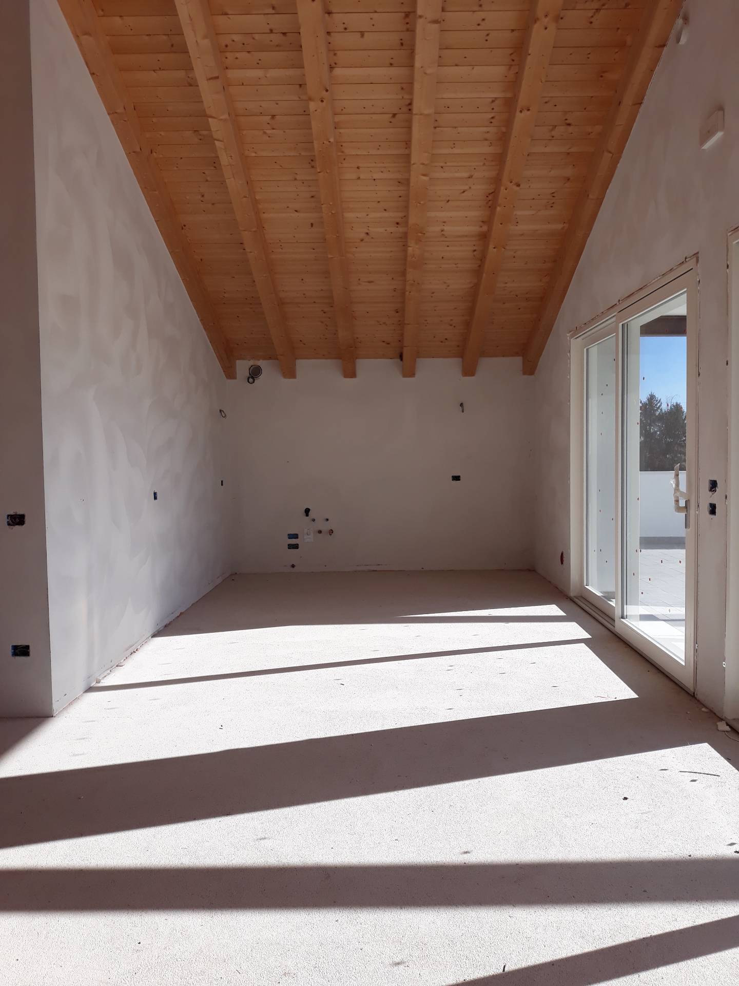 La zona giorno travata a vista si apre su un ampio e moderno soggiorno luminoso e spazioso con vetrate sul grande terrazzo di 147mq.