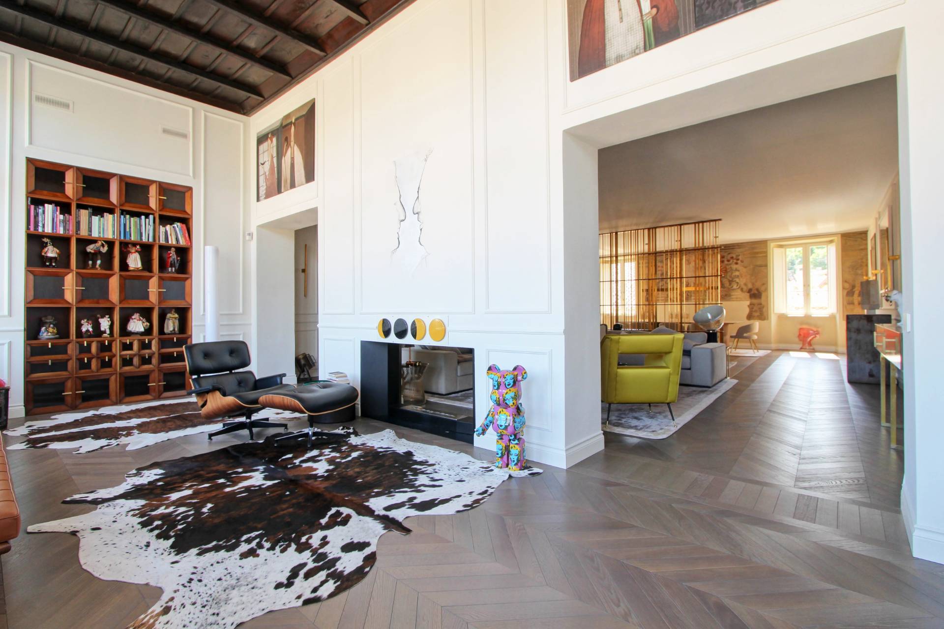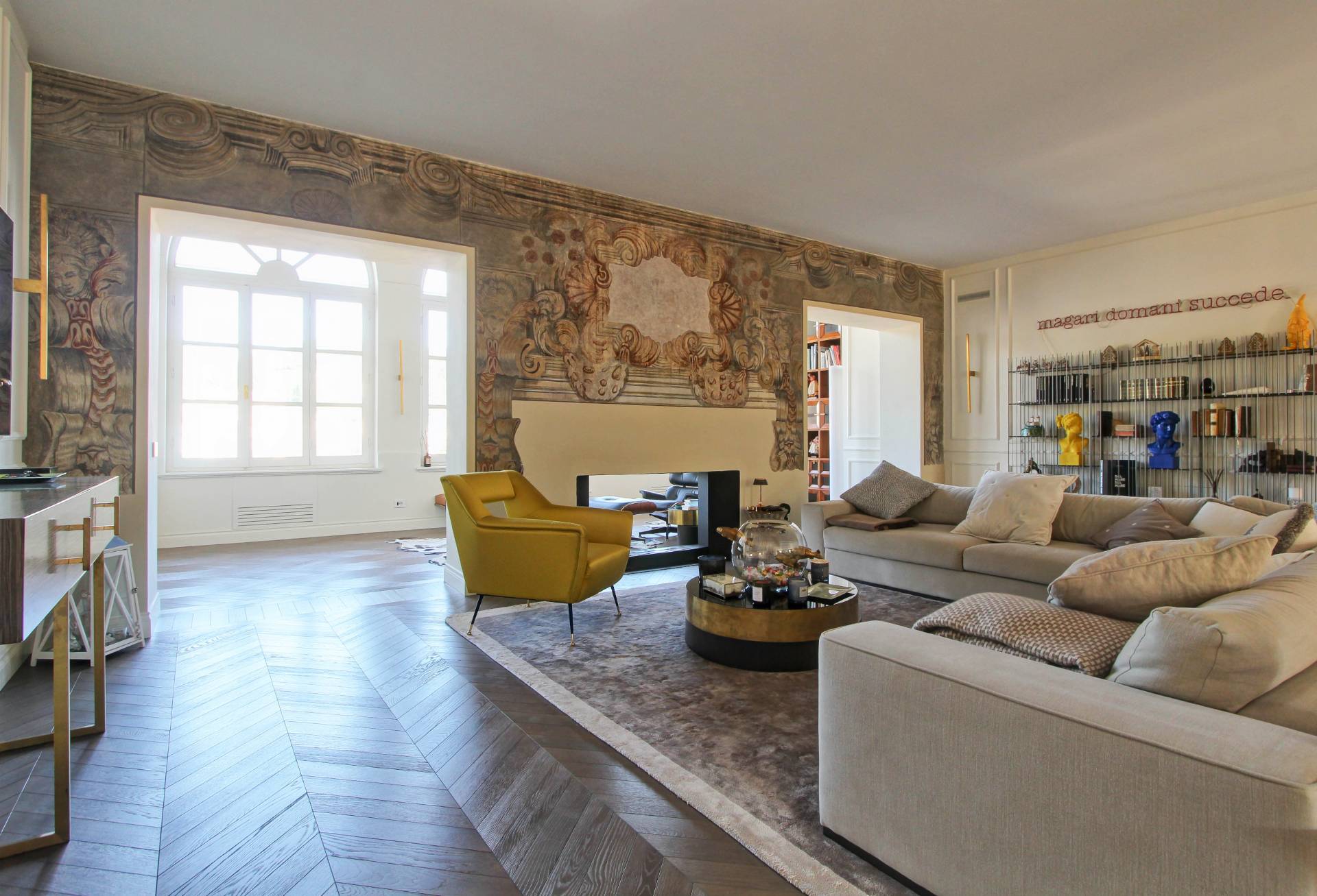 Nel soggiorno si trovano due ampi affreschi risalenti al XVII secolo che facevano da cornice a quel che era il salone delle feste.