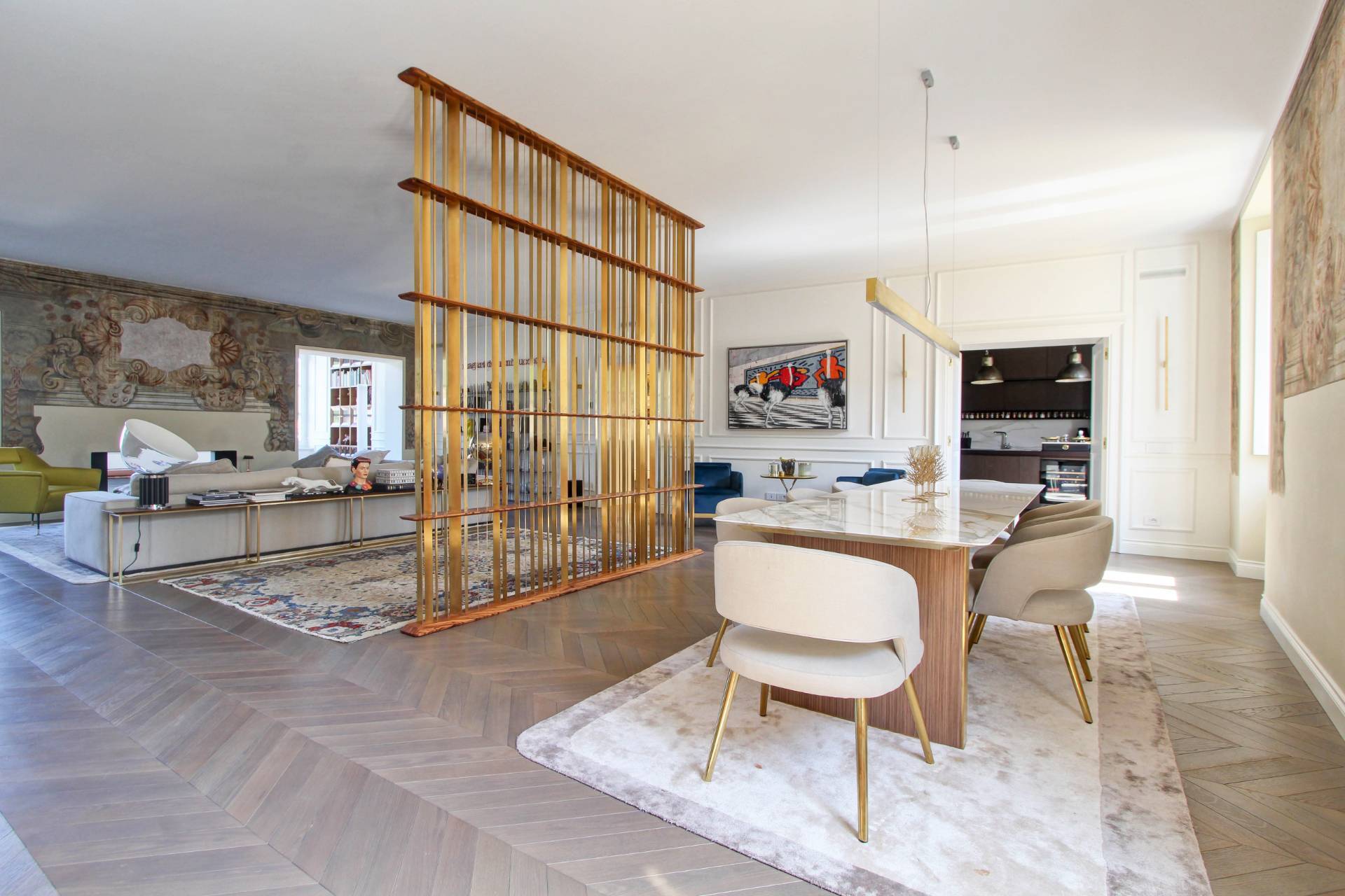 Il soggiorno diviso in zona living e zona pranzo, che da sulla cucina finemente arredata su misura con elettrodomestici di ultima generazione e cantina vini innestati in un ambiente con soffitto a cassettoni.