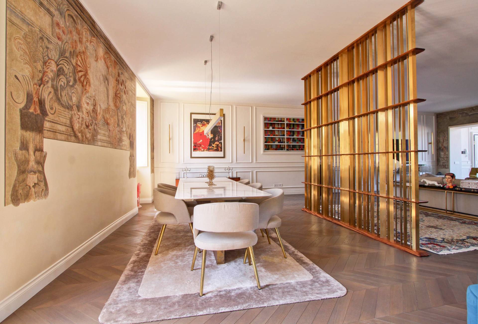 Il soggiorno diviso in zona living e zona pranzo, che da sulla cucina finemente arredata su misura con elettrodomestici di ultima generazione e cantina vini innestati in un ambiente con soffitto a cassettoni.