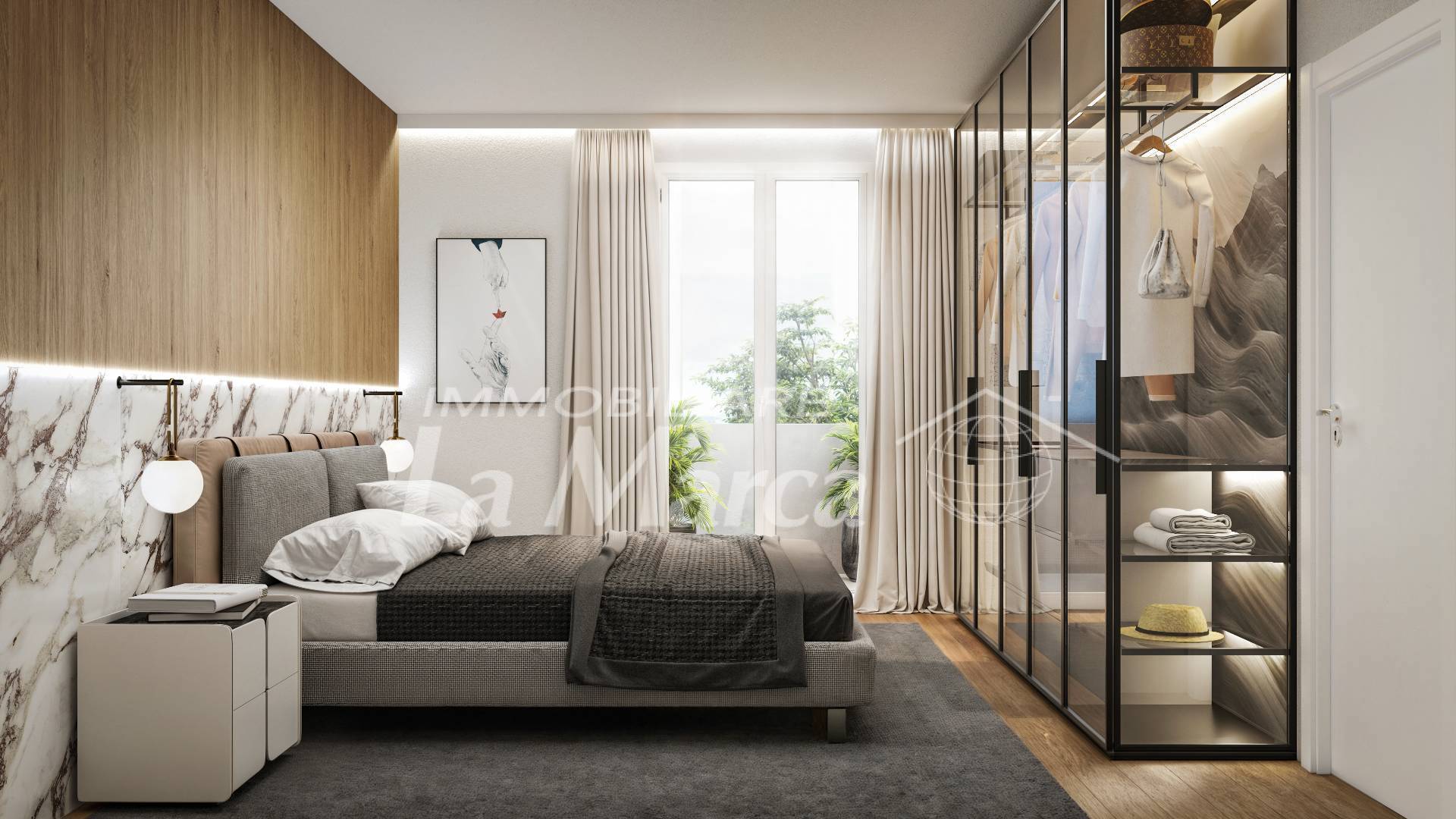 L'appartamento e' composto da ampia e luminosa zona giorno di circa 47 mq. con cucina a vista,zona pranzo e spazio ***.*******.** vetrate con affaccio sul grande terrazzo.