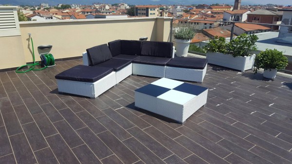 sanitari di tipo sospeso della Villeroy e Boch Impianto di riscaldamento: l'impianto di riscaldamento autonomo di tipo a pavimento con caldaia a condensazione con recupero dell'acqua calda sanitaria tramite pannello solare anch'esso autonomo Impianto di climatizzazione Tutti i vani sono dotati di impianto di climatizzazione Dal vano scale si accede alla terrazza privata dalla quale si gode di un panorama splendido che va dal mare alla pineta fino alle Alpi Apuane La terrazza dotata di una vasca idromassaggio jacuzzi modello santorini pro e di tutta una serie di allestimenti che ne permettono un utilizzo costante.