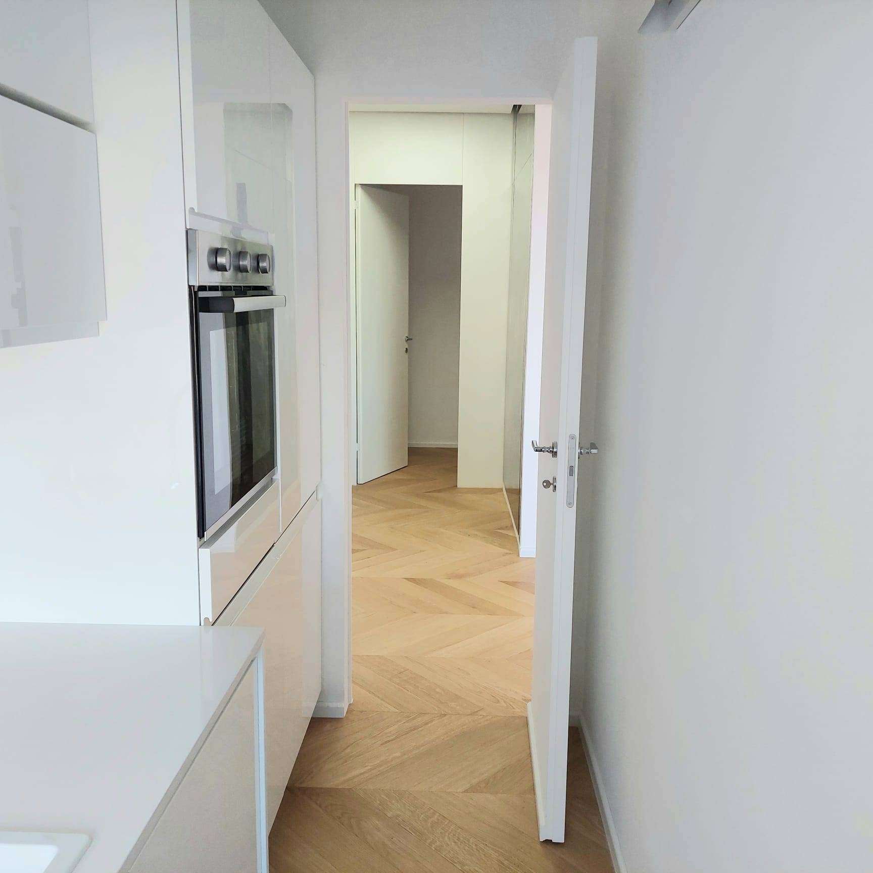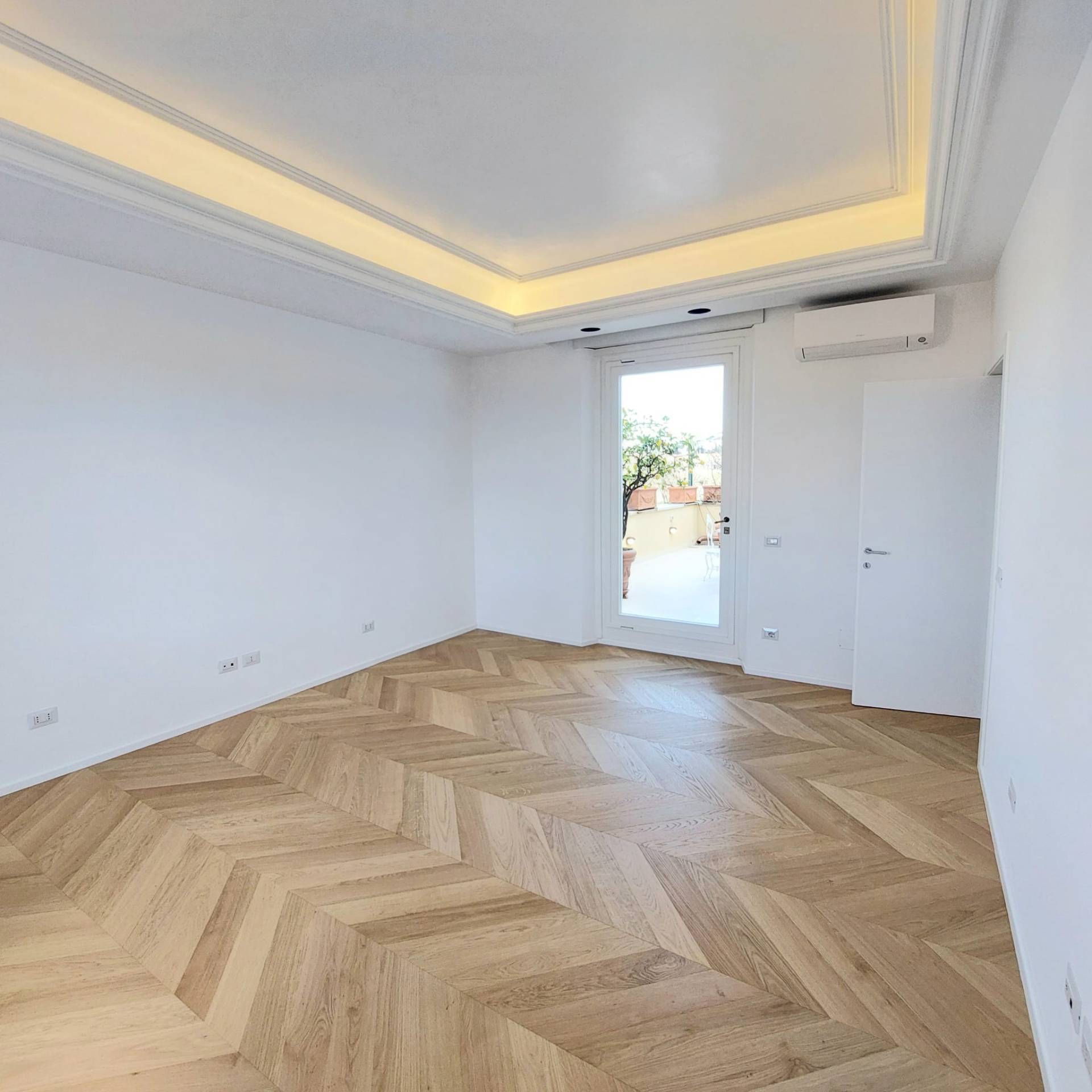 La zona notte comprende un'ampia camera matrimoniale con affaccio sulla terrazza, una seconda camera, perfetta come stanza ospiti, studio o guardaroba, un bagno in marmo con ampio box doccia e una cucina completamente arredata e accessoriata, pronta alluso.