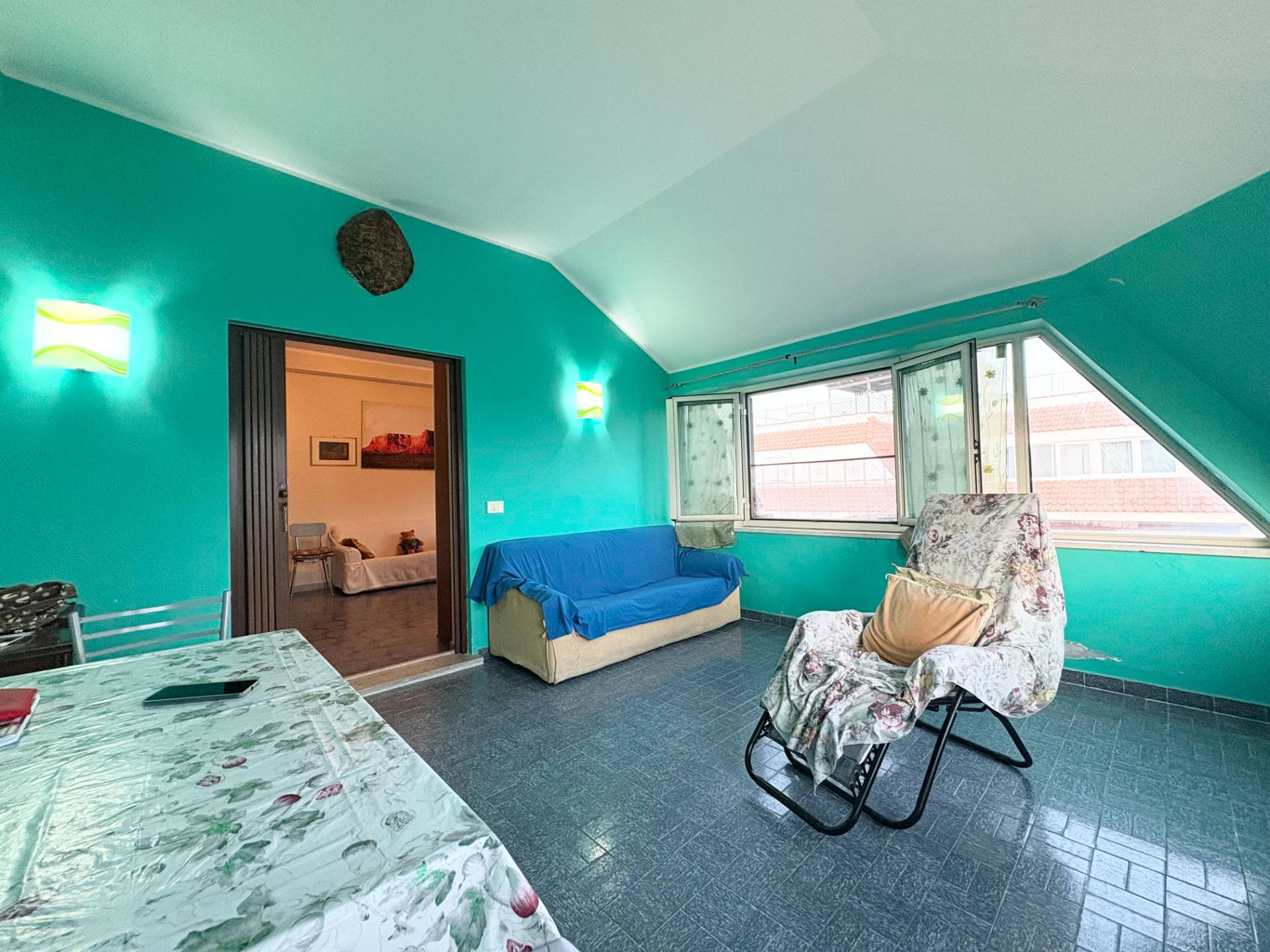 L'attico vanta di un ottimo affaccio luminoso e ventilato, dotato di infissi in alluminio doppio vetro e zanzariere.