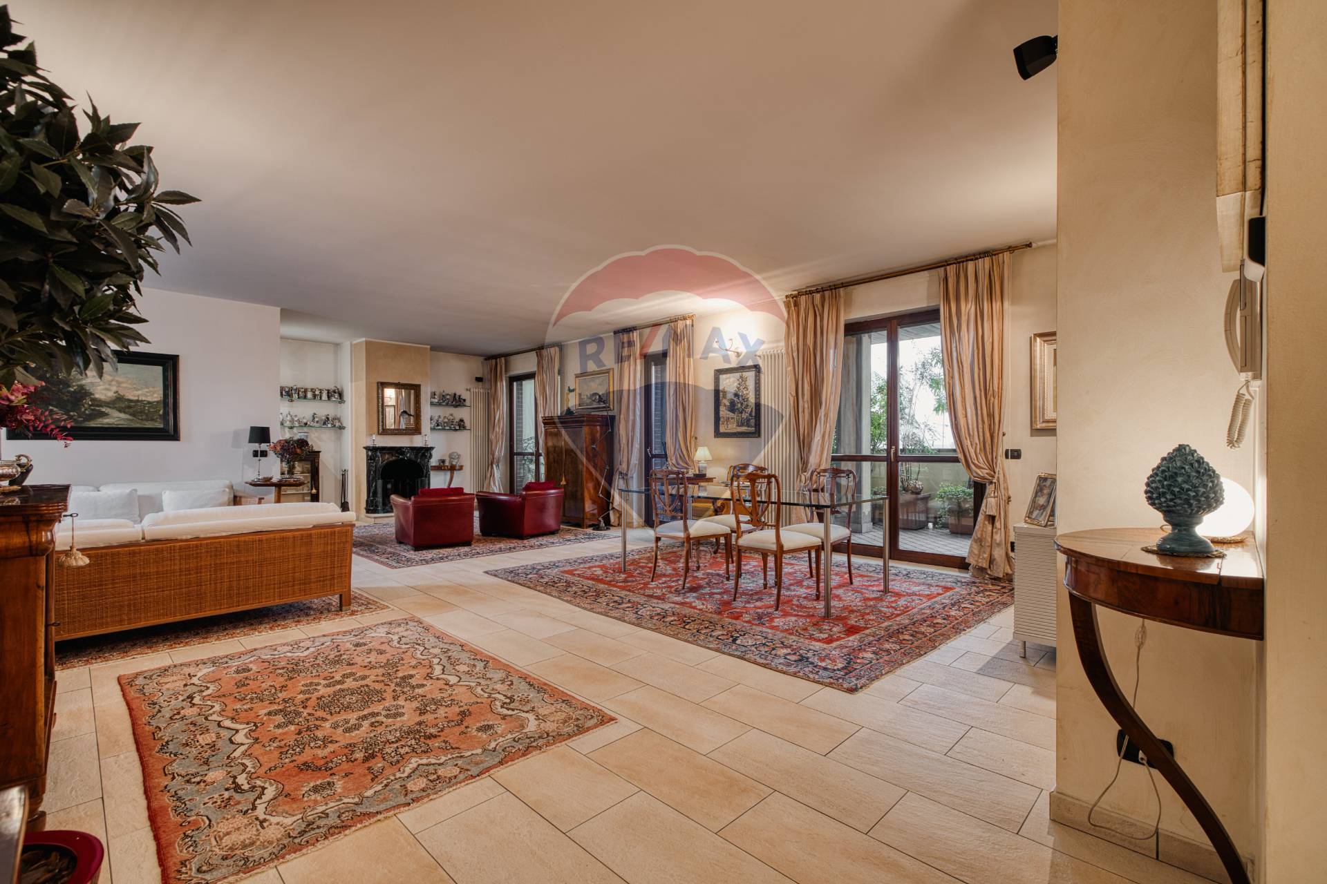 Le ampie vetrate affacciano sul grande terrazzo coperto, loggiato e piantumato di circa 50 mq, uno spazio esterno perfettamente vivibile e riservato, ideale per pranzi, cene e momenti di relax allaperto.