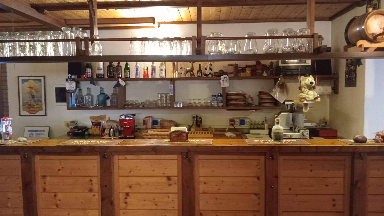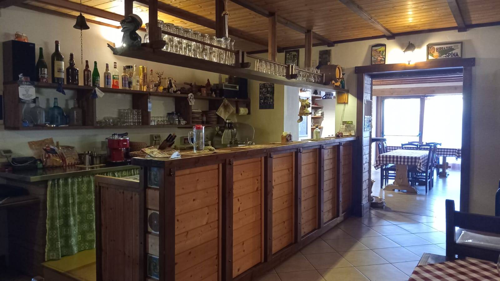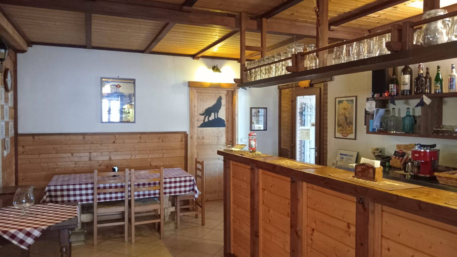 L' ambiente accogliente presenta un arredamento in legno rustico e un soffitto con travi a vista, creando una suggestiva atmosfera calda e familiare.