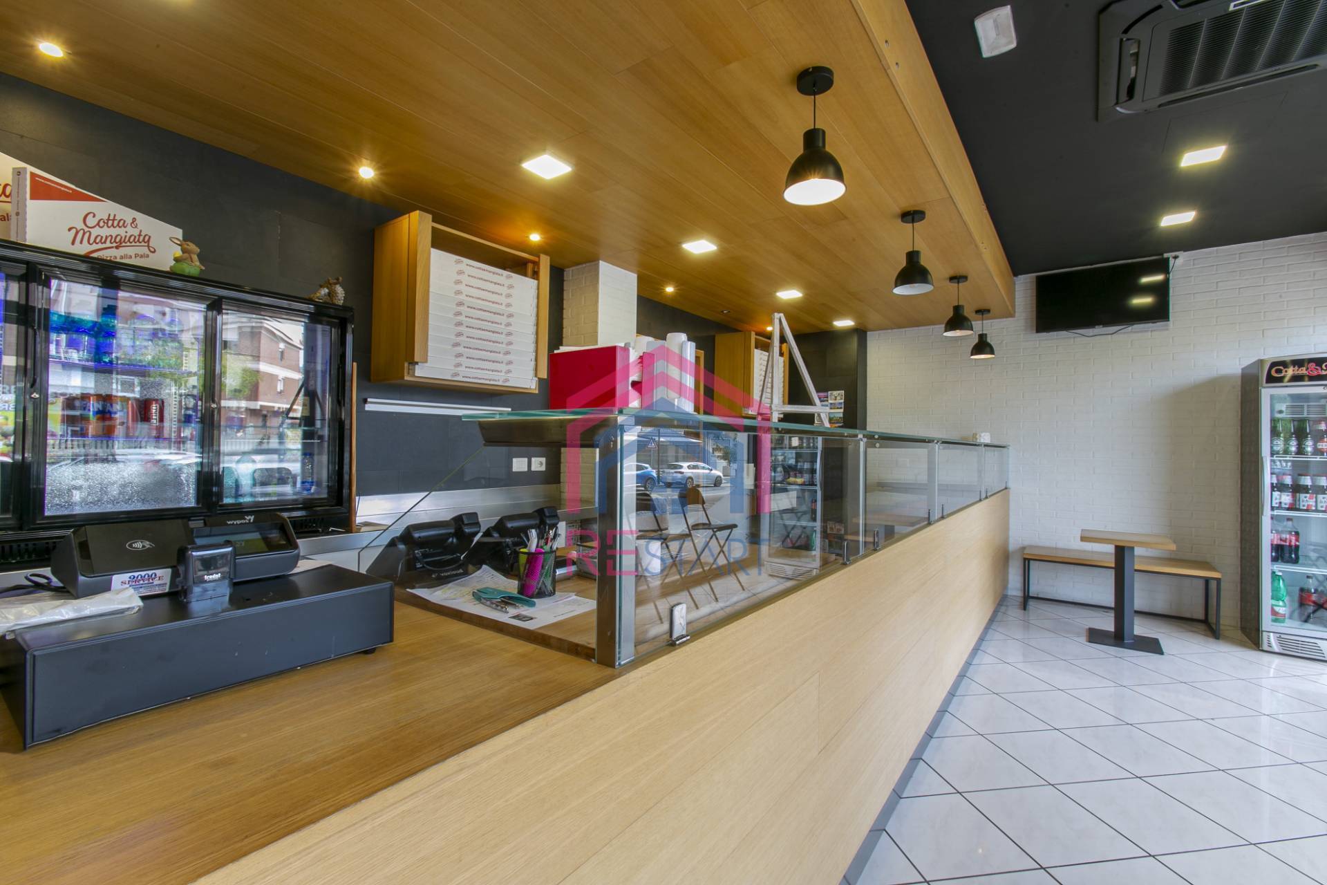 Laltro adibito per la vendita al pubblico con un banco pizza di mt. 6,00 ed un retro-banco completo di lavello.