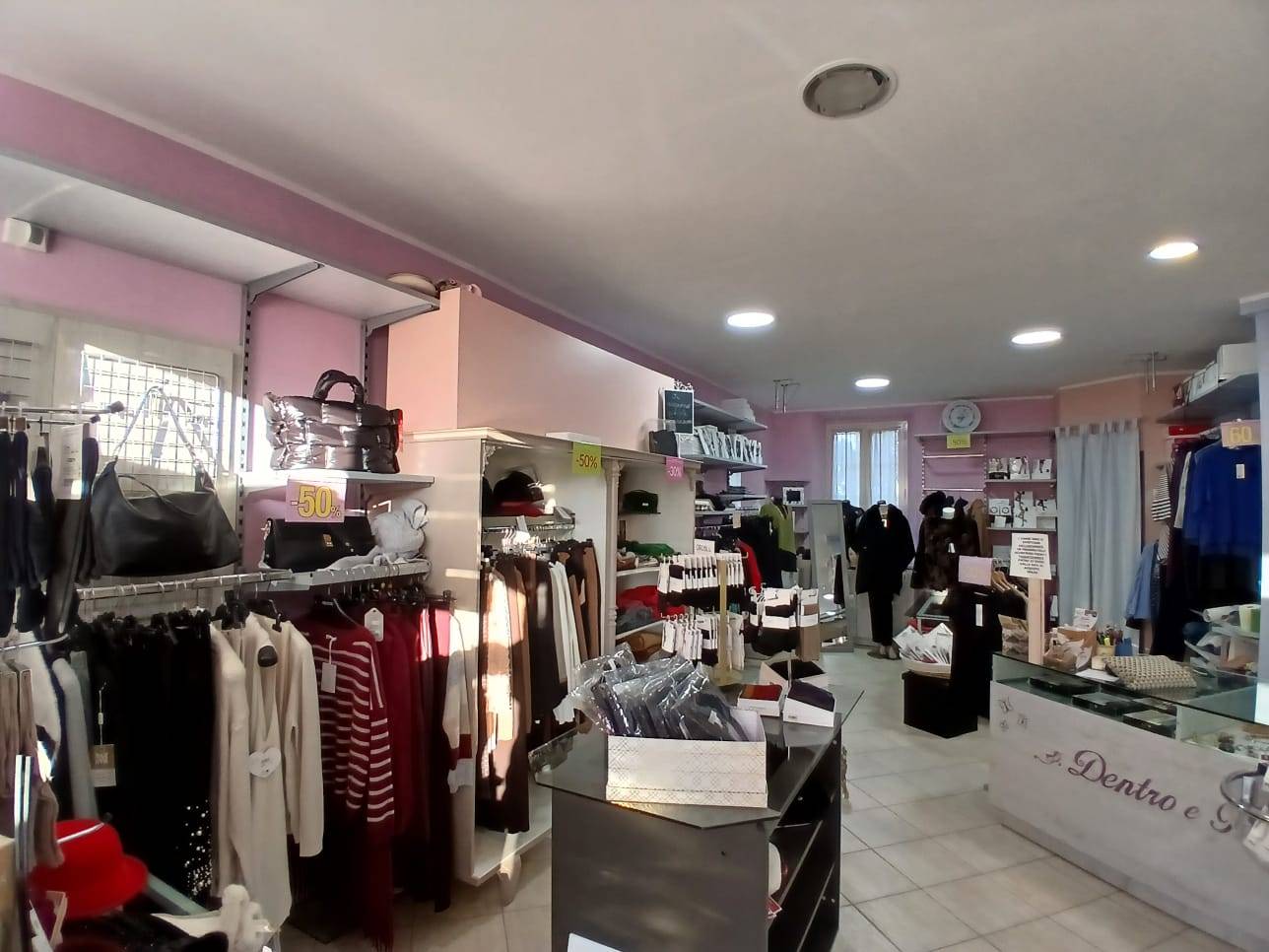 La distribuzione interna funzionale e ben organizzata, con spazi dedicati ai reparti di intimo e abbigliamento, camerino prova, e retro con comodo magazzino attrezzato con scomparti per lo stoccaggio della merce stagionale e delle diverse taglie.
