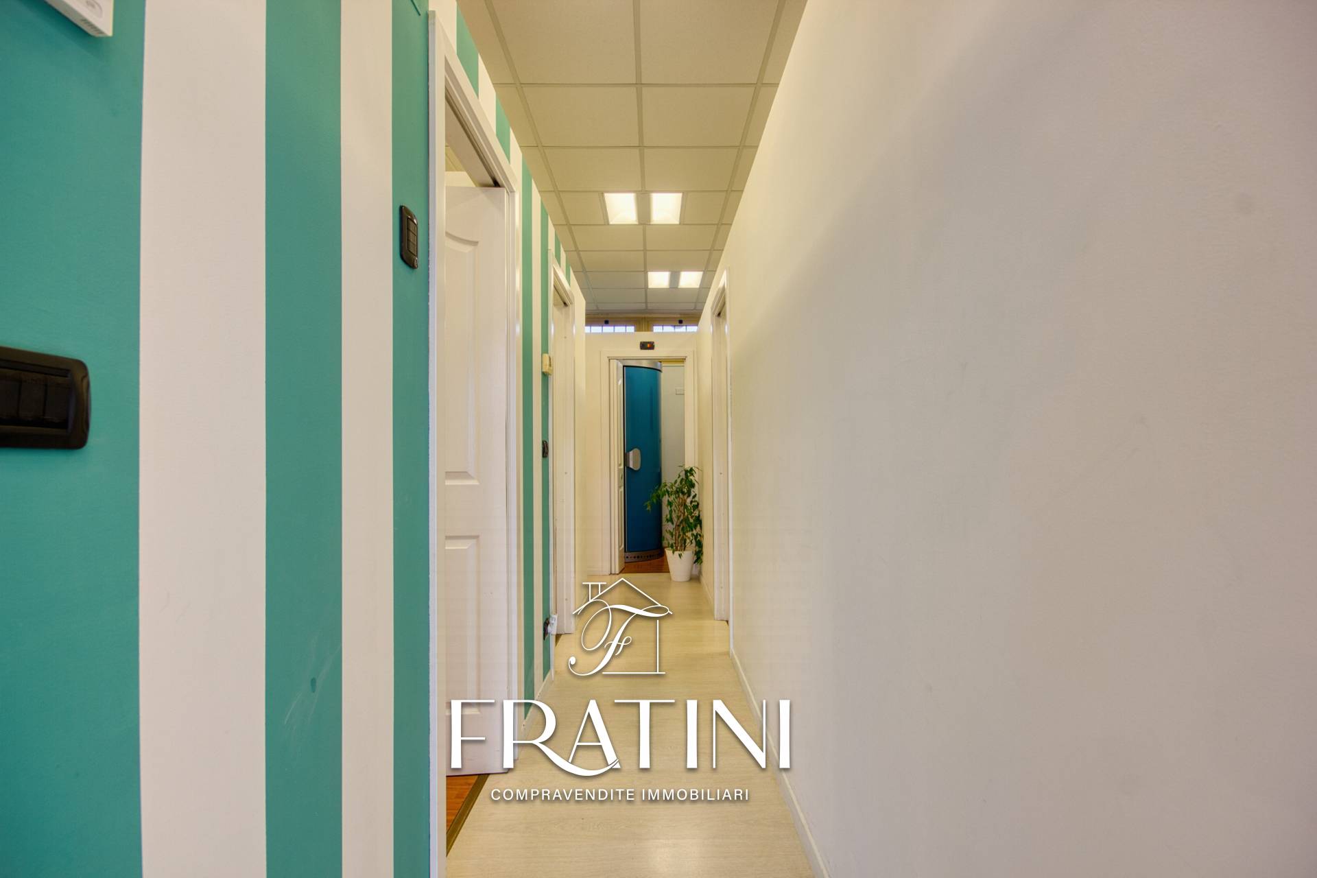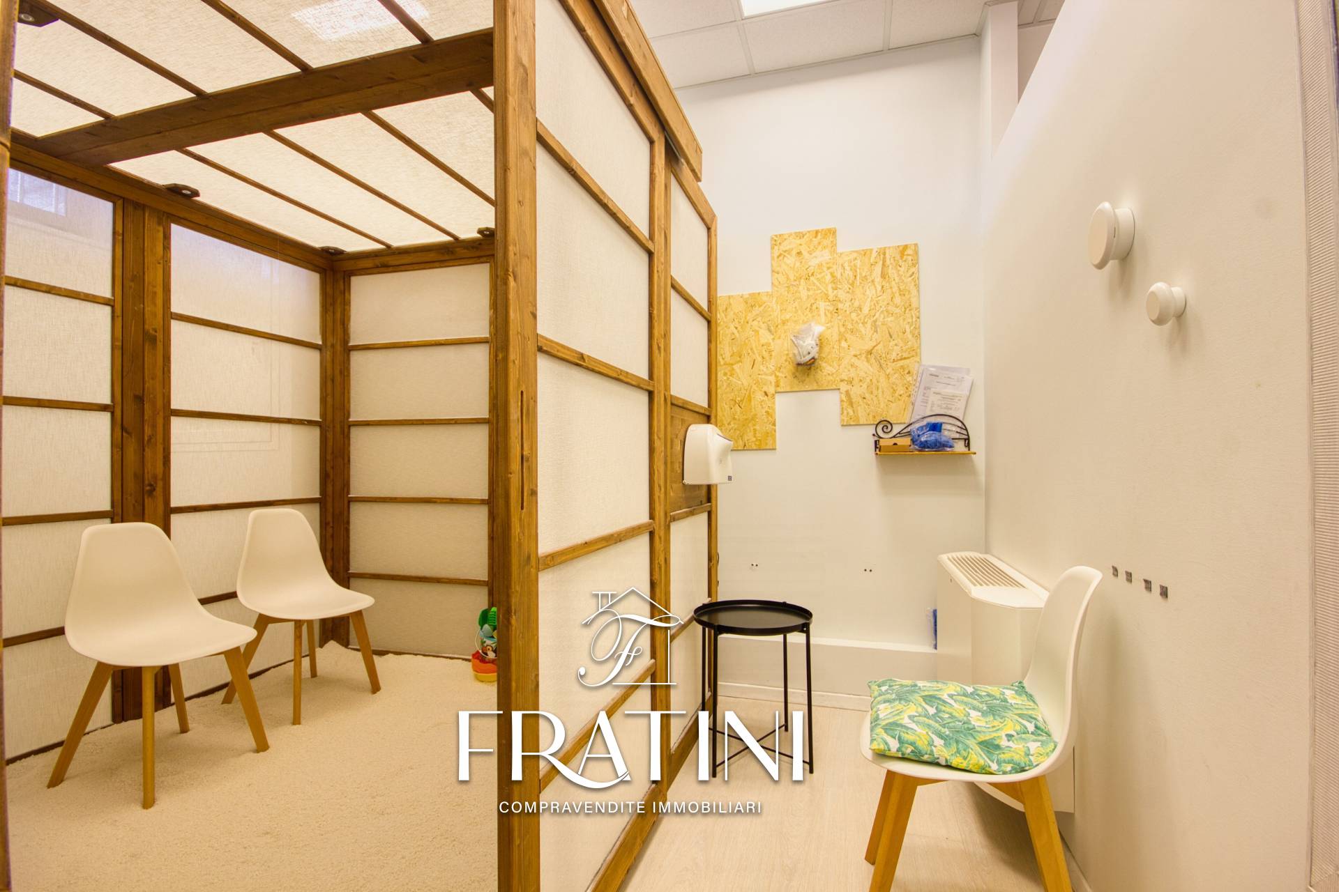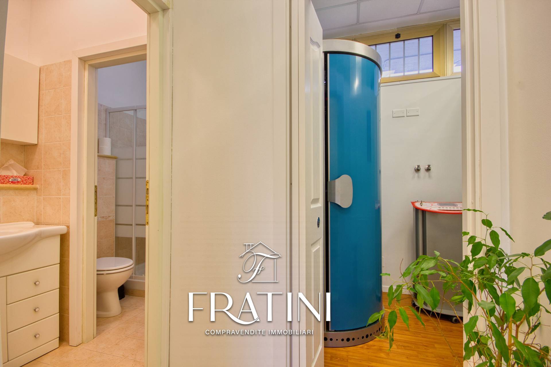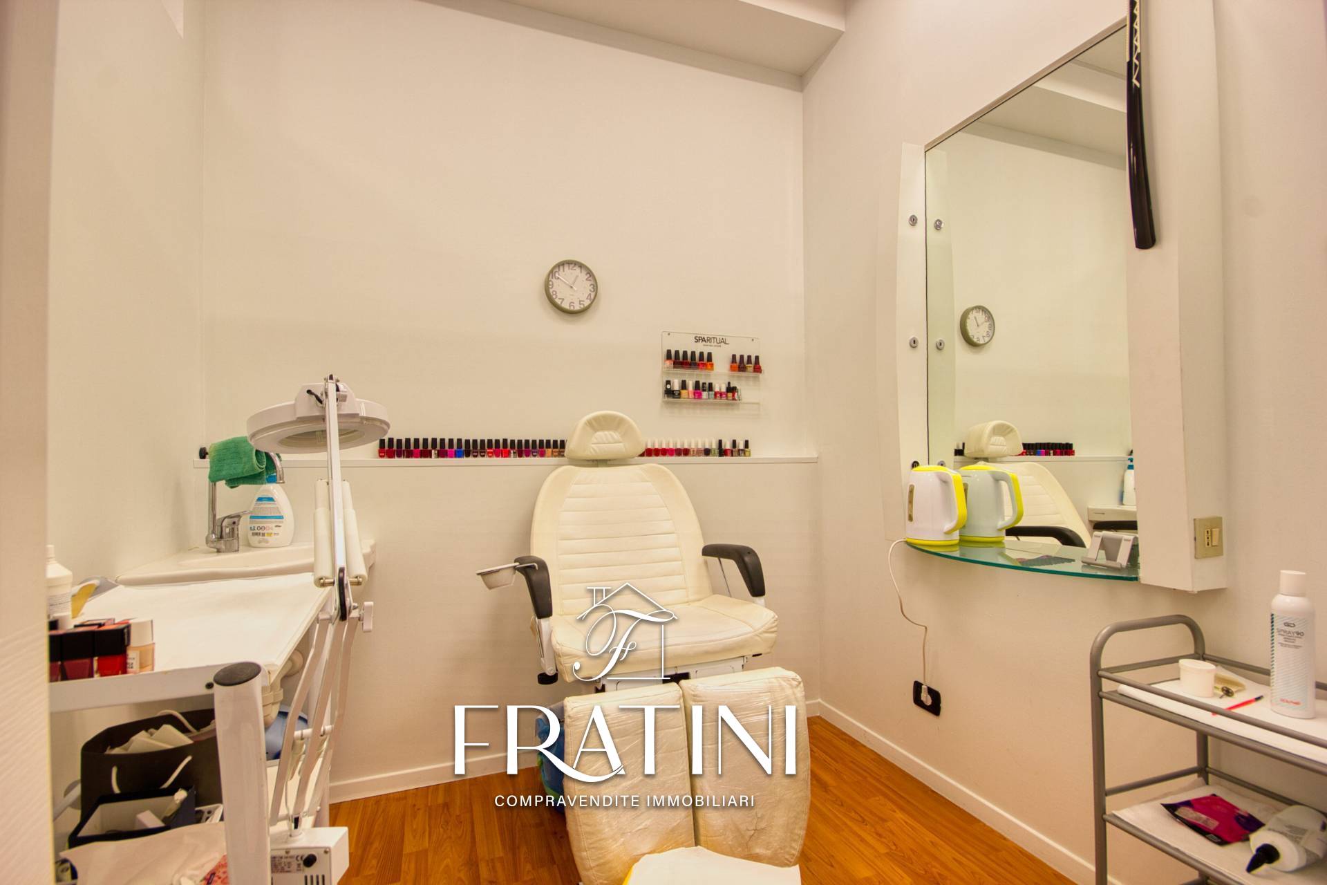 Sulla destra si trovano lufficio, la stanza manicure, la stanza ceretta, un ripostiglio e un locale adibito a magazzino e sanificazione, completo di lavandino, lavatrice e frigorifero.