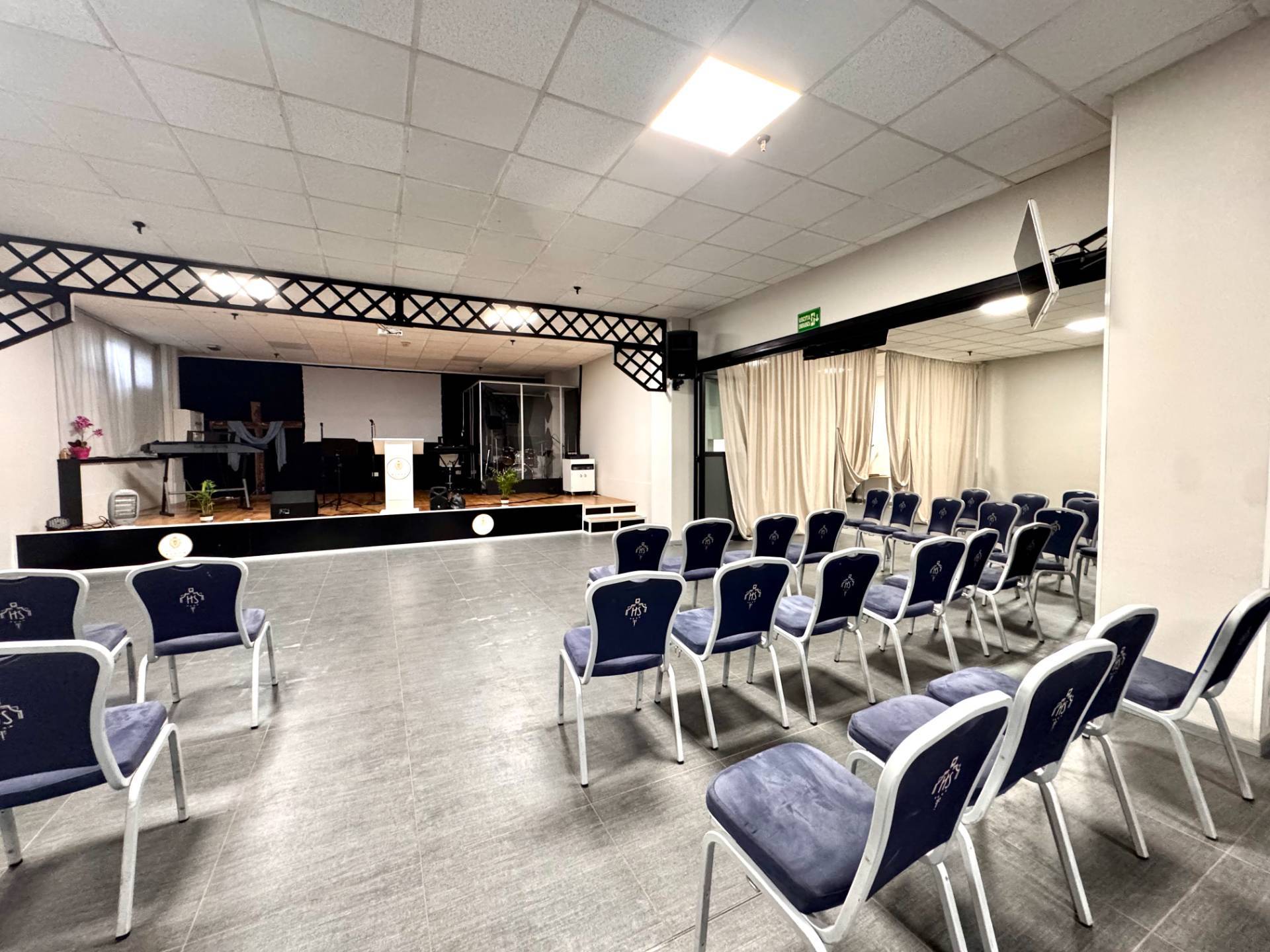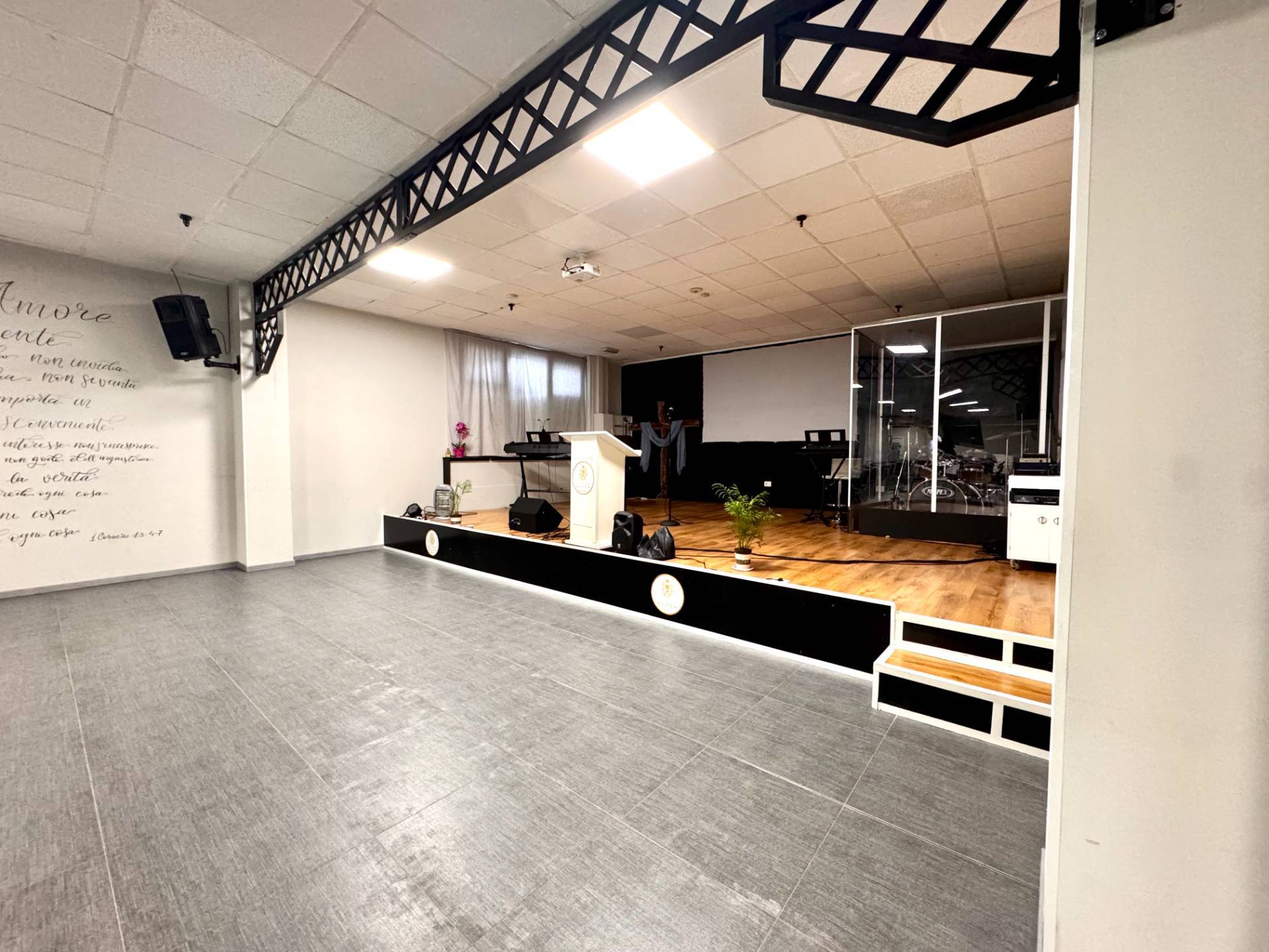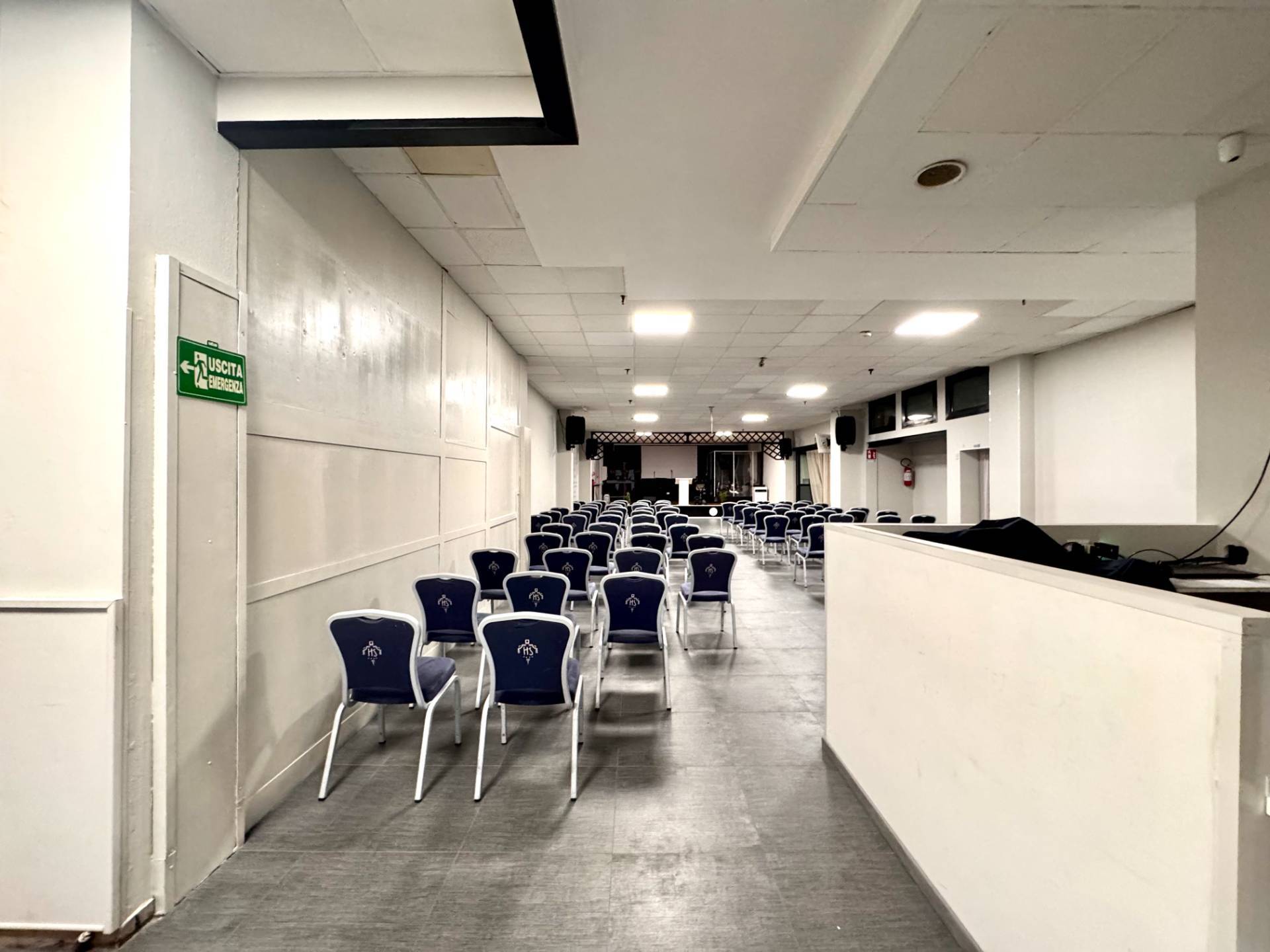 L'immobile attualmente adibito a sala conferenze, diverse stanze pluriuso, cucina con canna fumaria, wc, magazzino e altri spazi funzionali al deposito.