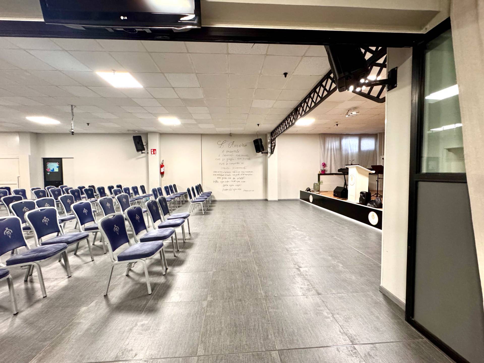 L'immobile attualmente adibito a sala conferenze, diverse stanze pluriuso, cucina con canna fumaria, wc, magazzino e altri spazi funzionali al deposito.