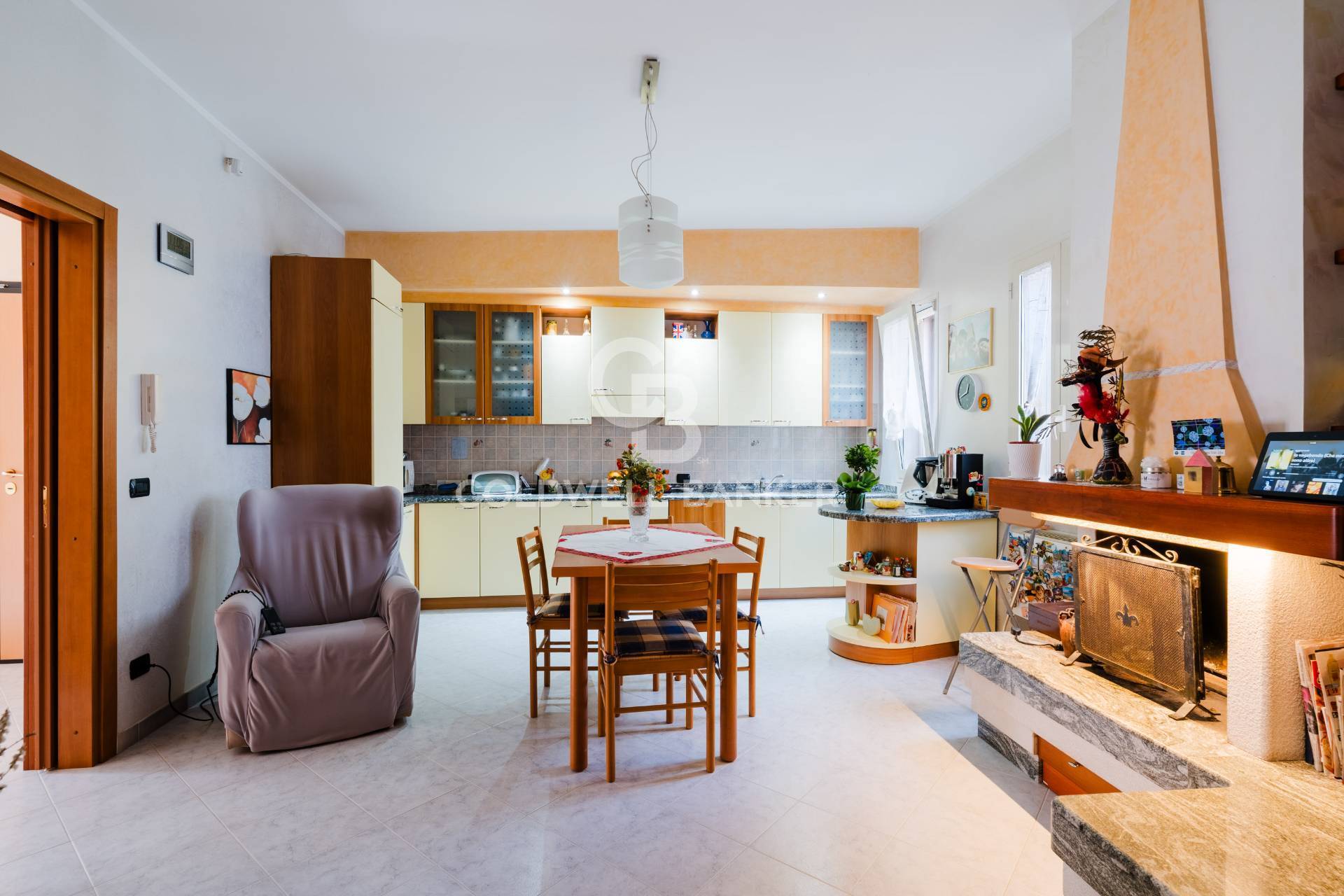 La zona giorno si apre con un ampio ingresso che conduce, da un lato, al soggiorno, luminoso e perfetto per i momenti di convivialit, e dallaltro al tinello-cucina, ambiente caldo e raccolto reso ancora pi accogliente dalla presenza di un camino.