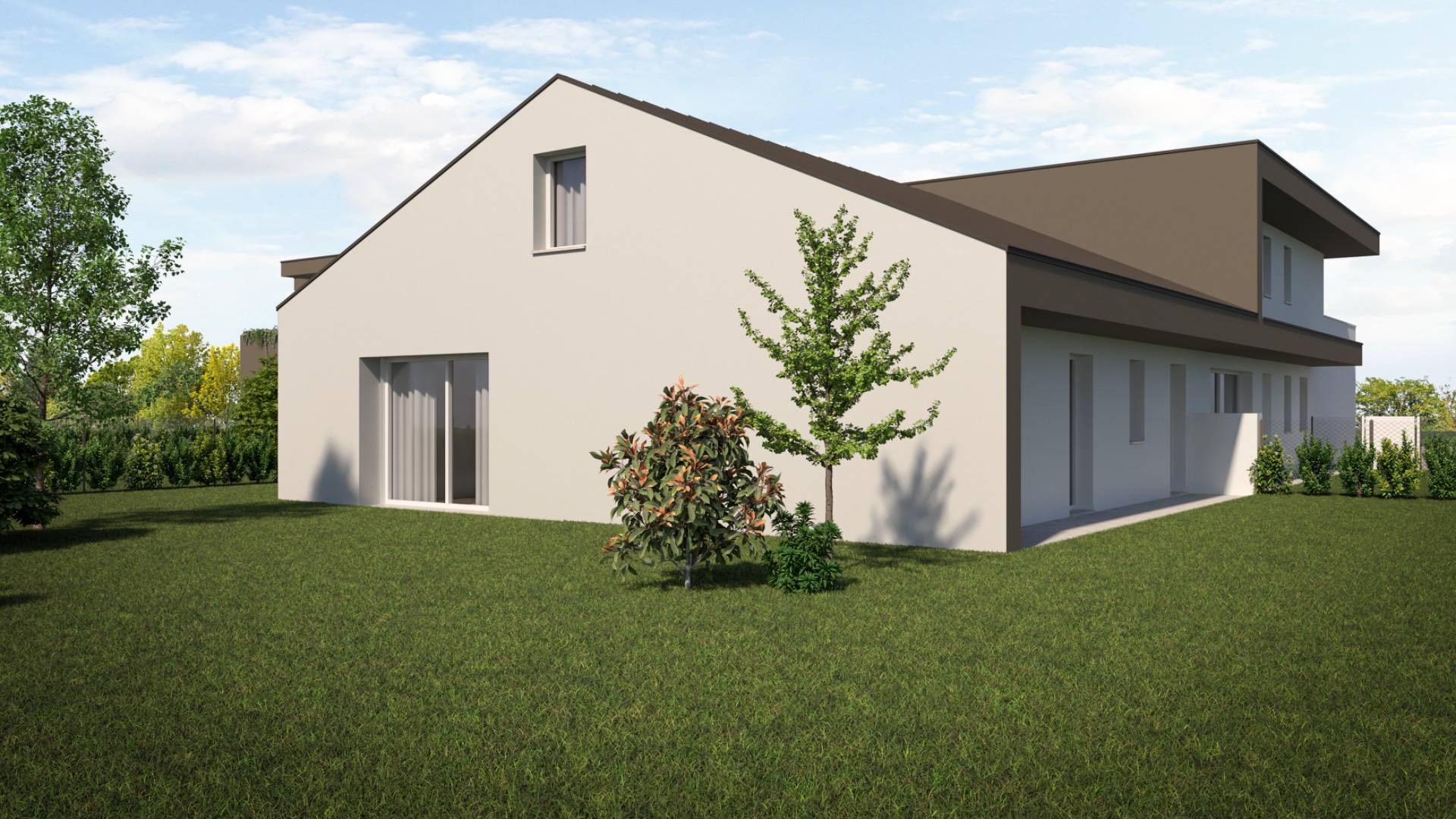 Labitazione si apre su un elegante portico di 11 mq che si affaccia direttamente su un ampio giardino privato.