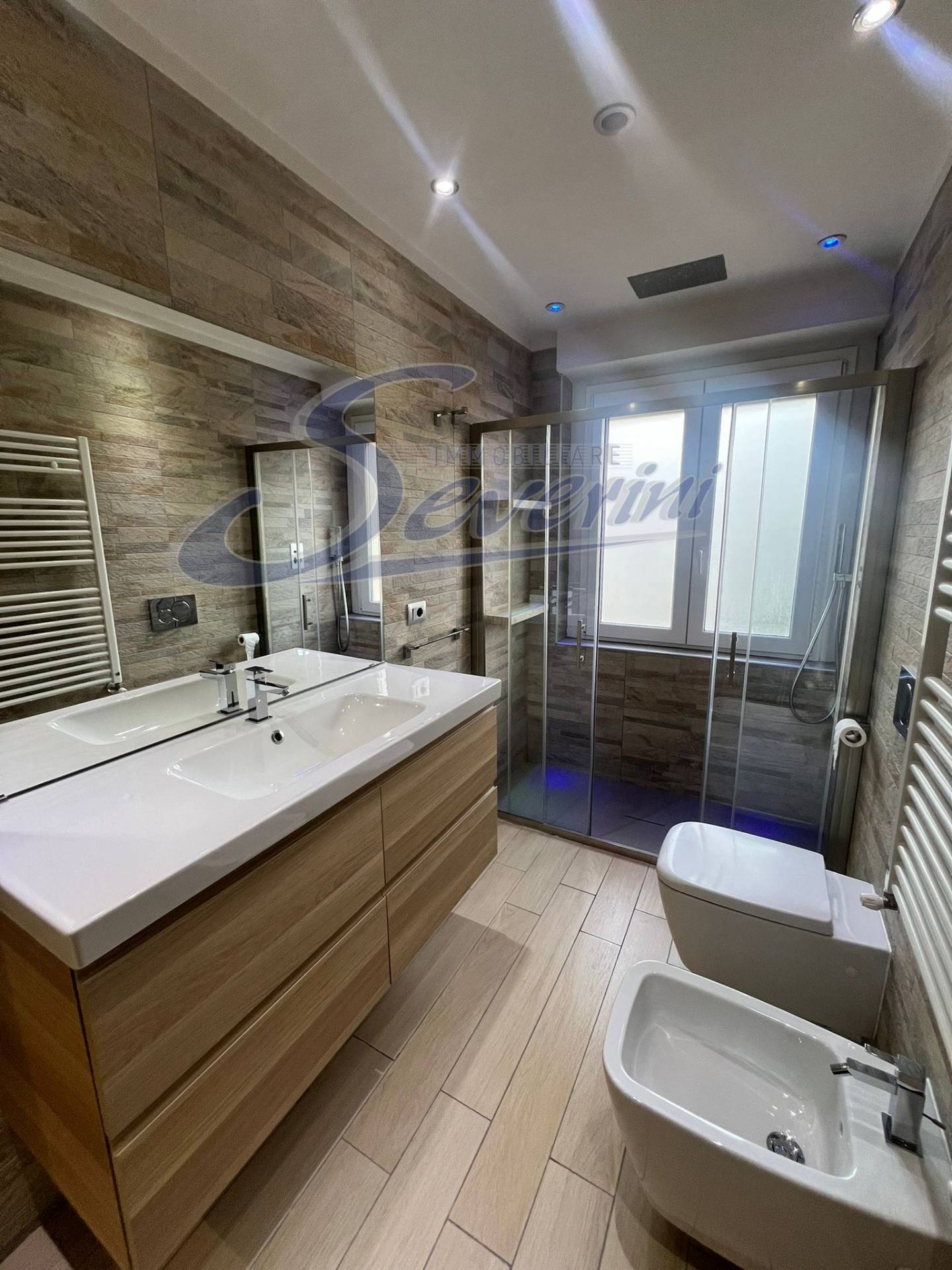 Bagno finestrato moderno con ampia doccia.