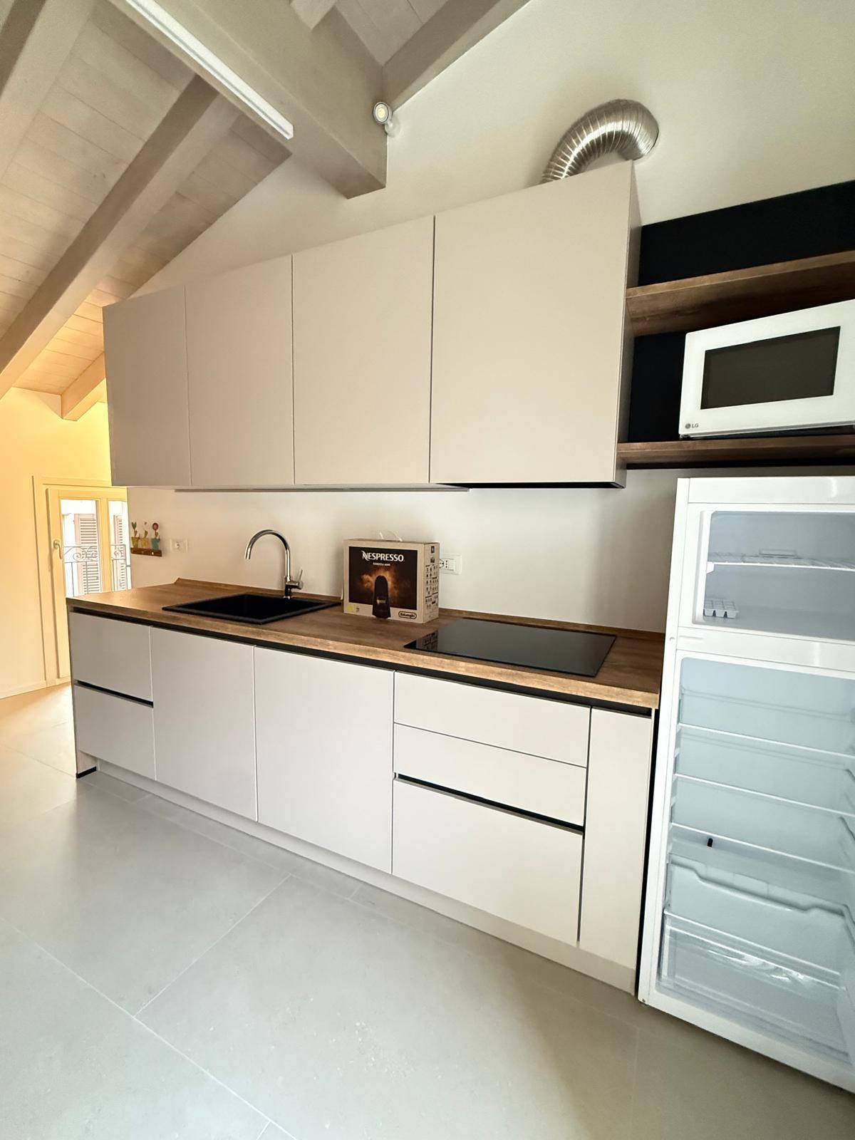 L'arredamento moderno e funzionale, con una cucina a vista che si affaccia sul soggiorno.
