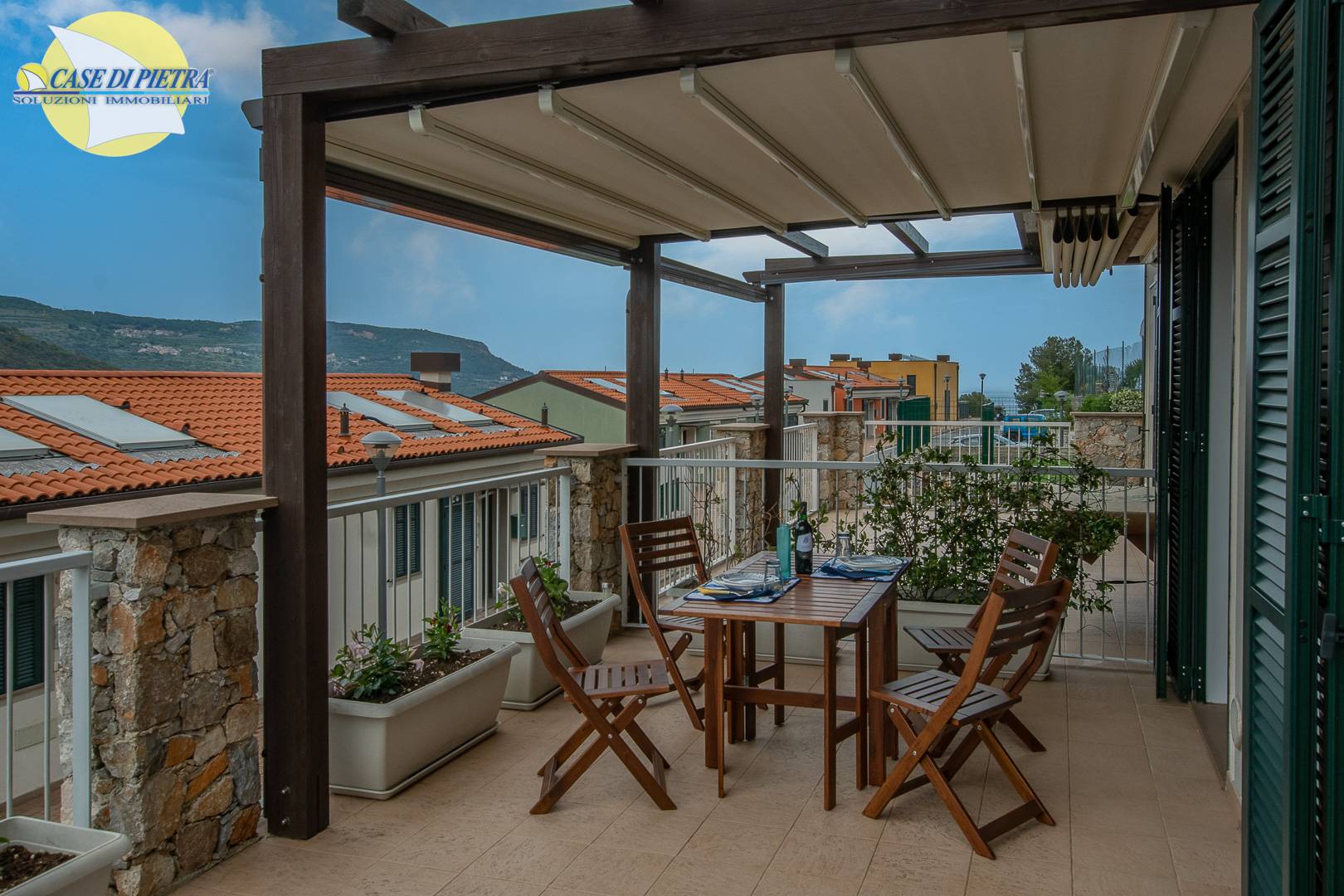 La soluzione, con ingresso indipendente, composta da luminoso soggiorno open-space con cucina a vista e accesso alla grande e soleggiata terrazza di 20 mq con gazebo in legno di 9 mq correlato con nuova pergotenda automatizzata.