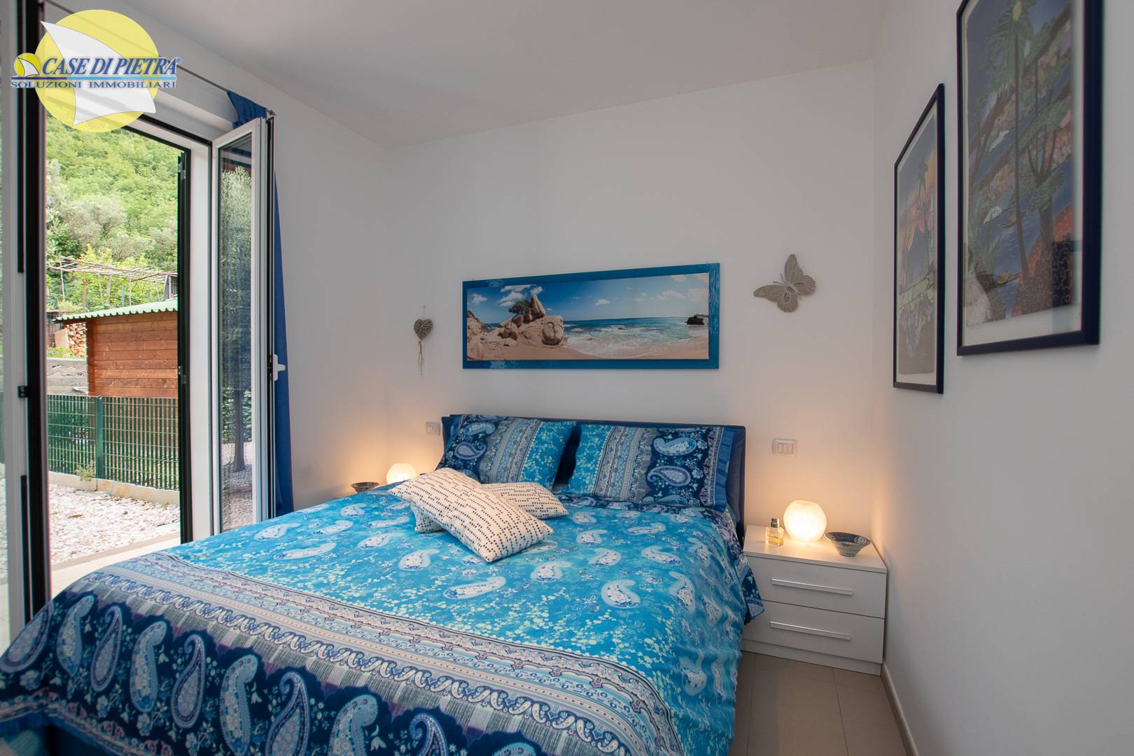 Camera matrimoniale con accesso al giardino privato retrostante di 30 mq con ciottoli di marmo bianco di Carrara e rosso di Verona, recintato con cordoli in pietra, piantumato con ulivo, aiuola di pogdala e siepe di 6 metri di gelsomino, con relativo impianto automatico di irrigazione.