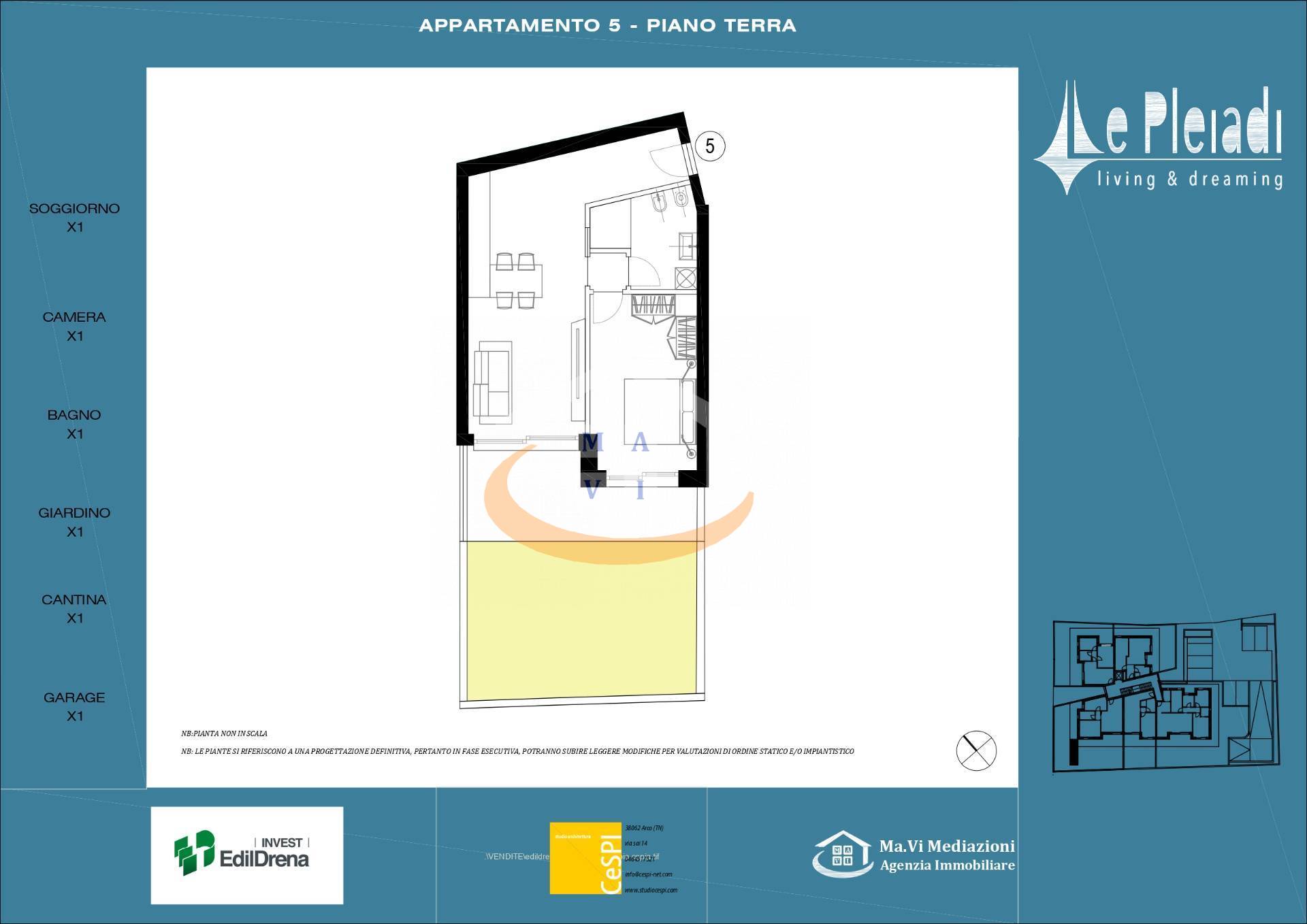 Il comfort garantito in ogni stagione, grazie a impianti ad alta efficienza e materiali selezionati con cura. BILOCALE A PIANO TERRA (Rif. 5) Ingresso, soggiorno/cucina, bagno e camera matrimoniale.