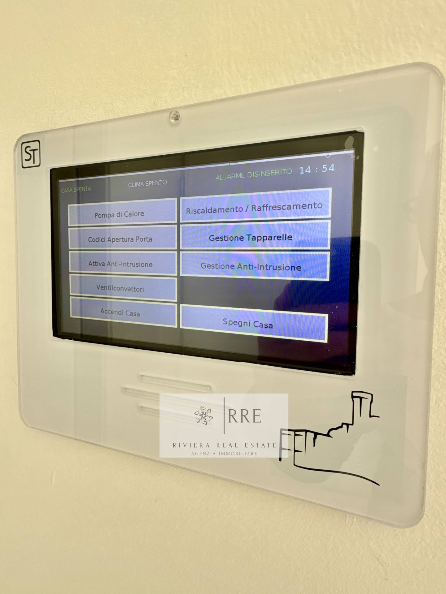 Tecnologia: Gestione domotica completa (impianti a pavimento, termoconvettori, oscuramenti, codice porta, videocitofono) con possibilit di implementazione (es. impianto di allarme). Serramenti: Di altissima qualit Schco, con profilo Minimal sul fronte mare per massimizzare le grandi superfici vetrate e la luce naturale, e profilo tradizionale sul retro.