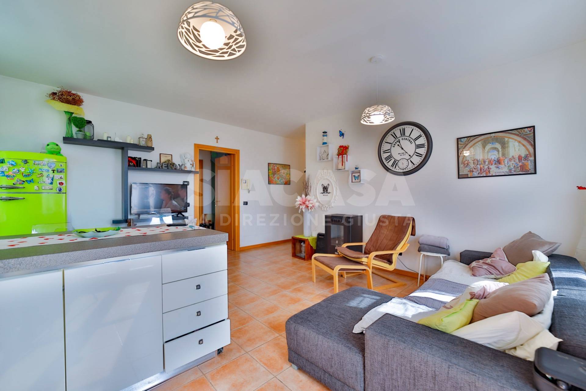La zona giorno, luminosa e accogliente, servita da doppie porta finestra affacciate a sud con accesso a un balcone panoramico che regala una vista aperta sui campi circostanti, ed ulteriore finestra ad ovest che garantisce luce naturale fino al tardo pomeriggio nella zona giorno.