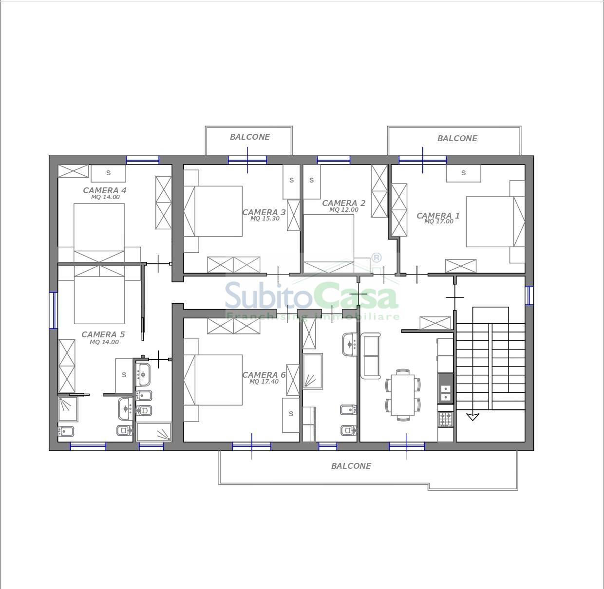 L'appartamento totalmente ristrutturato, situato al Primo piano senza ascensore, si compone da un ingresso con soggiorno e angolo con cucina con uscita sul terrazzo, 6 ampie camere matrimoniali di cui una con bagno, oltre a 2 bagni con doccia; L'appartamento dotato di mobilia nuova, rifiniture nuove, infissi nuovi in pvc, climatizzatori in ogni camera, riscaldamento autonomo oltre a tutti i materiali di finitura di ottima qualit.