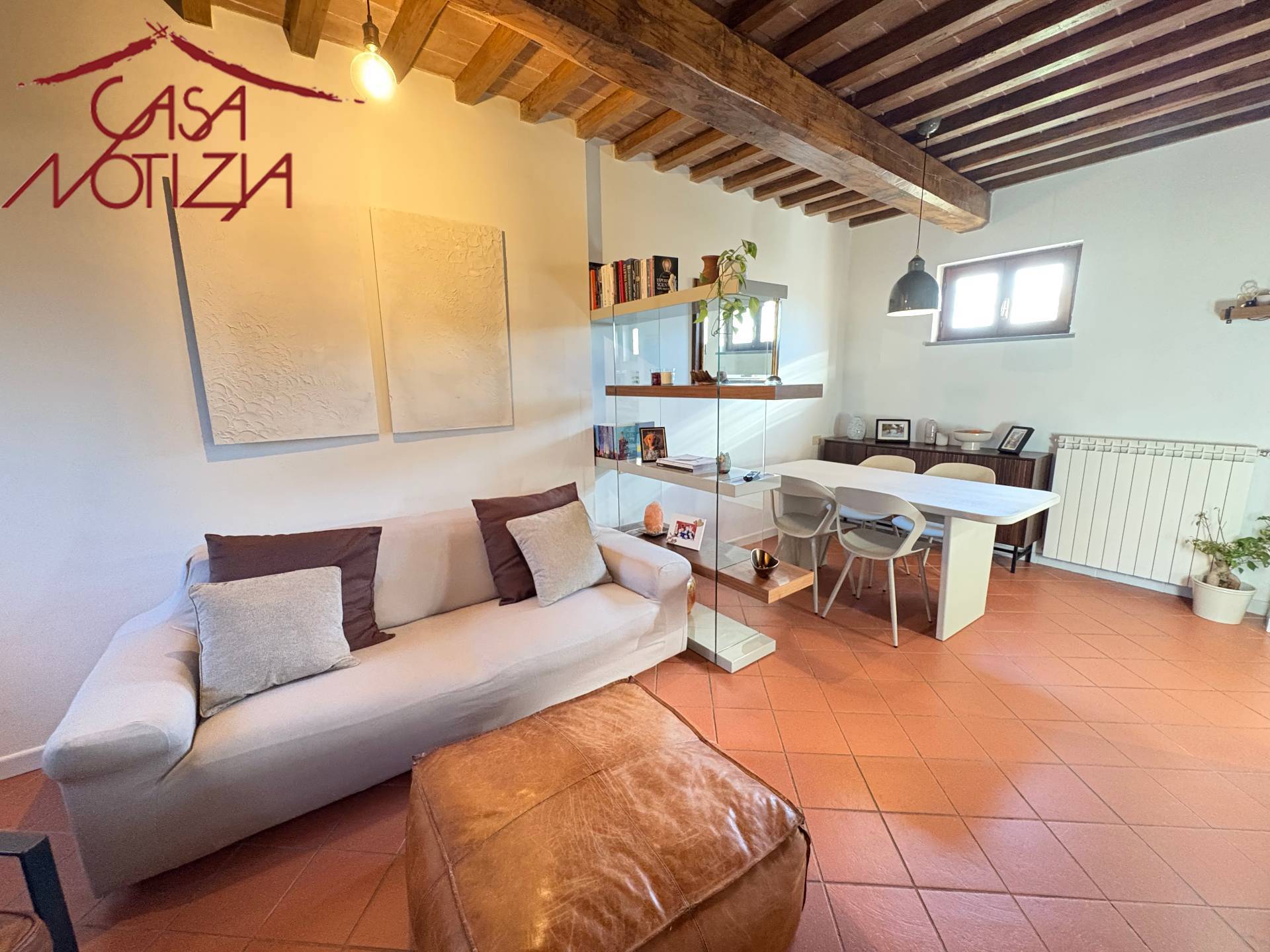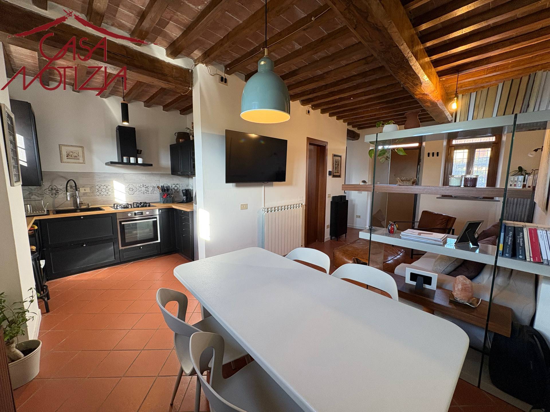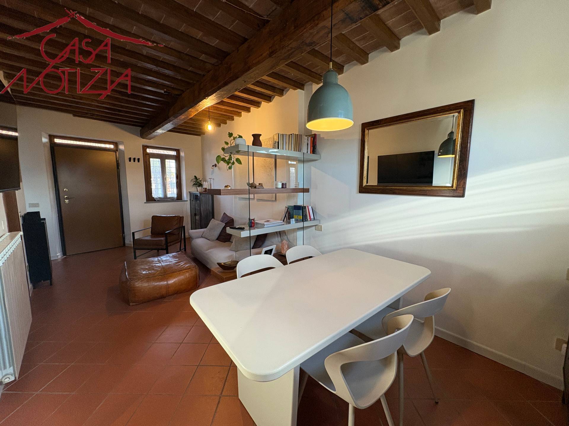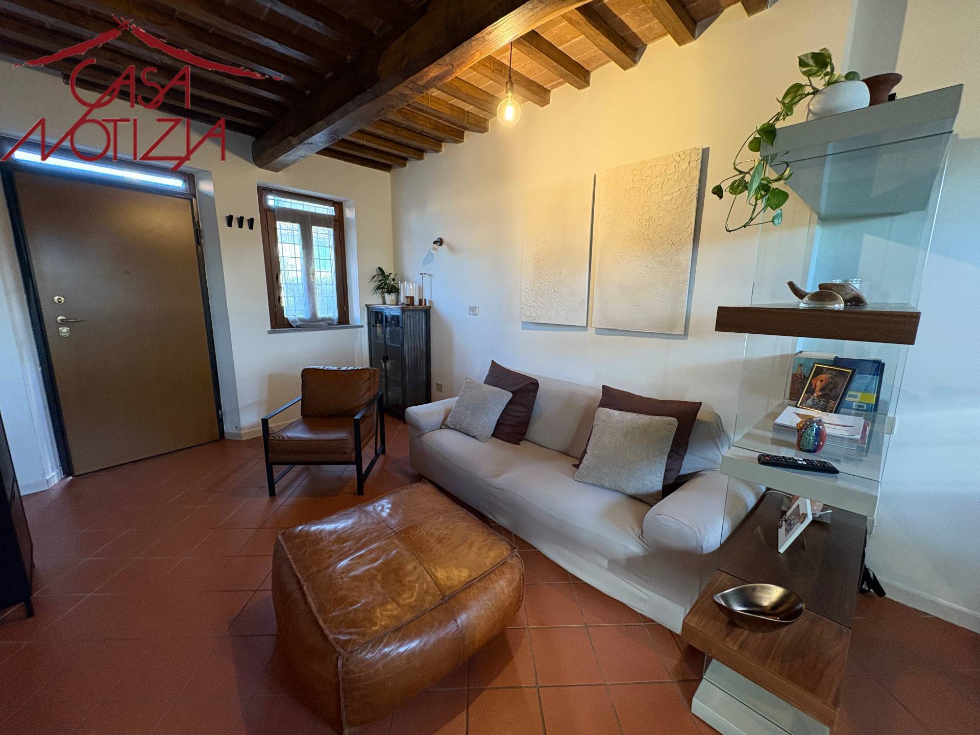Gli interni si distinguono per il perfetto equilibrio tra tradizione e comfort: soffitti con travi a vista, pavimenti in cotto, infissi in legno con doppi vetri e finiture curate in ogni dettaglio.