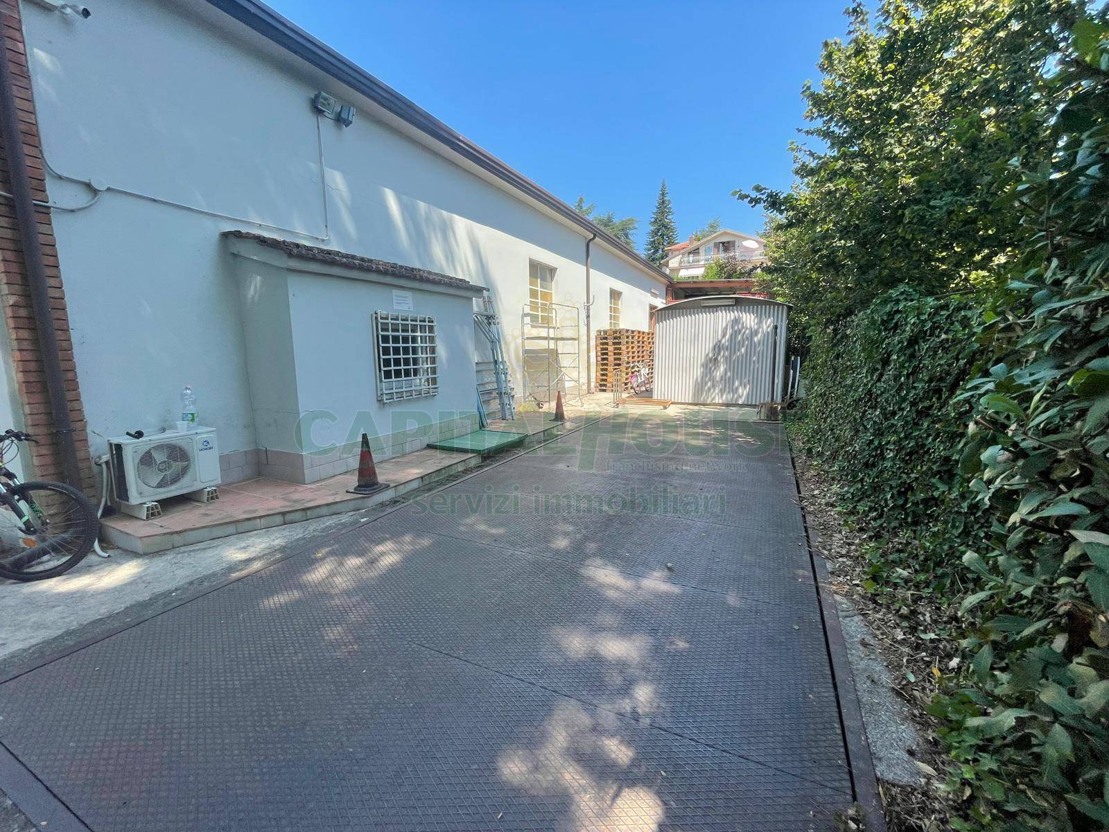 Esternamente vi una tettoia di 100 Mq e 4.000 Mq di aree scoperte che includono piazzale antistante e terreno.