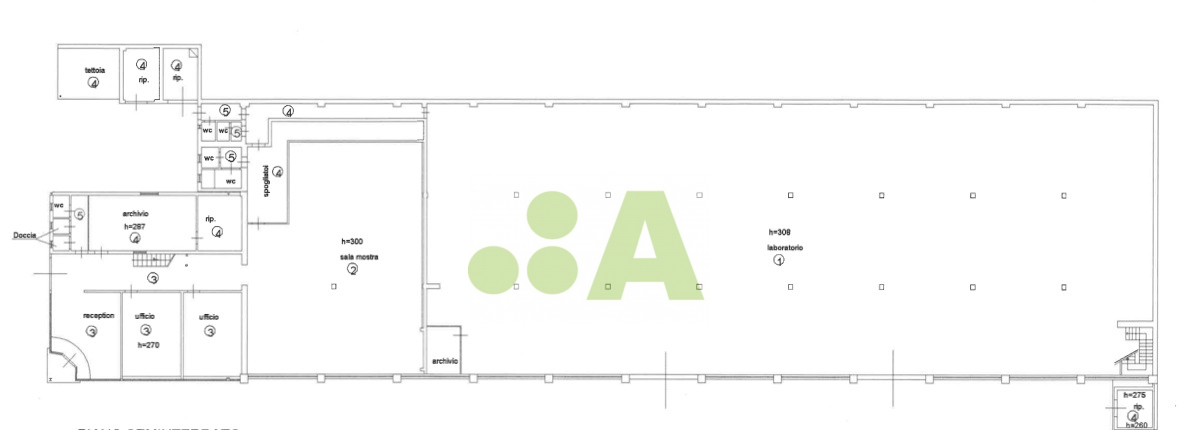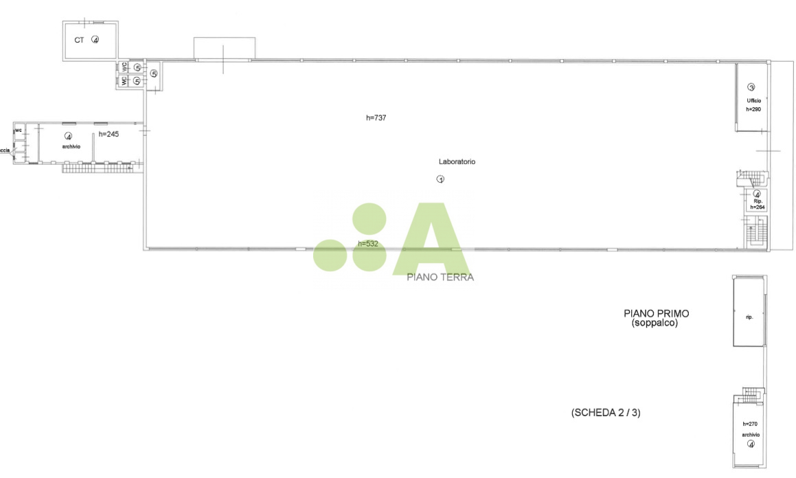 Al piano primo laboratorio con altezza 5,70 m e 7 m, servizi, ufficio e archivio.