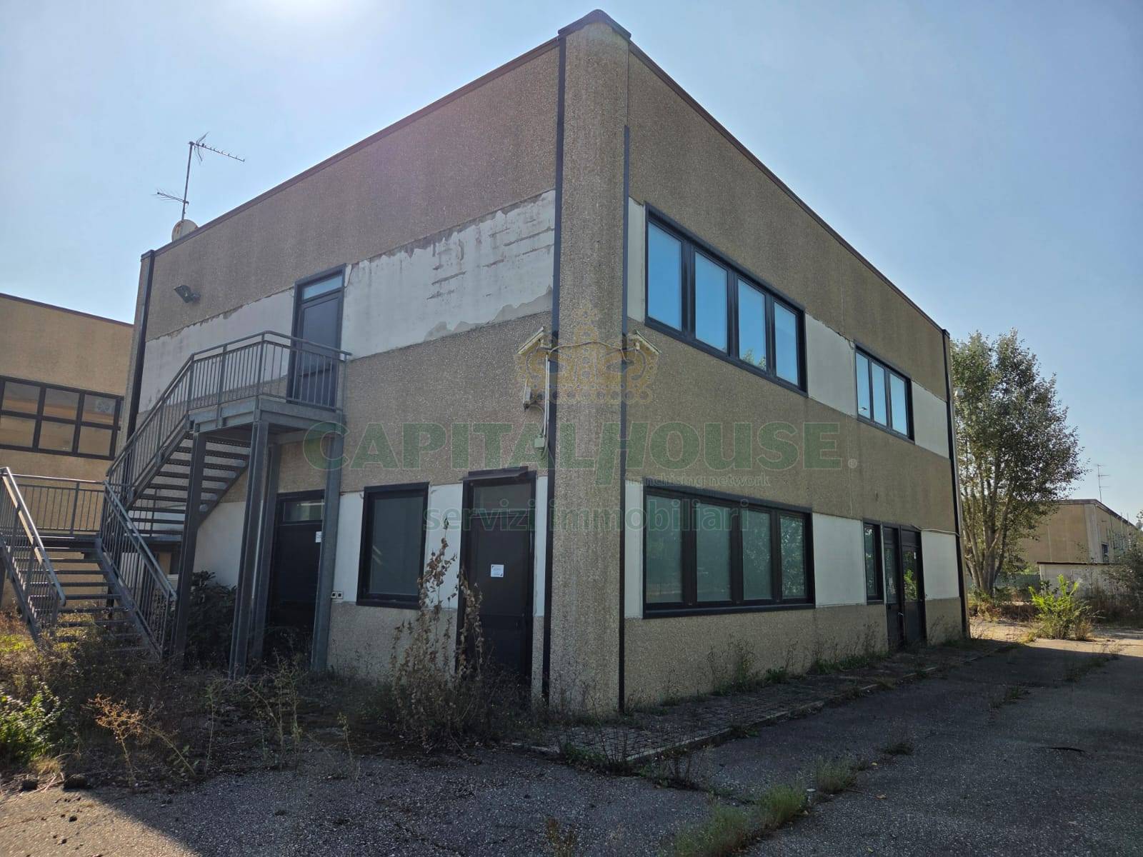 Capannone Artigianale con Blocchi Uffici in Area Produttiva In vendita, all'interno di un'area di lottizzazione produttiva, un immobile industriale composto da un capannone artigianale e un blocco uffici su due piani, con accesso diretto da un ampio passo carraio adatto al transito di mezzi pesanti.