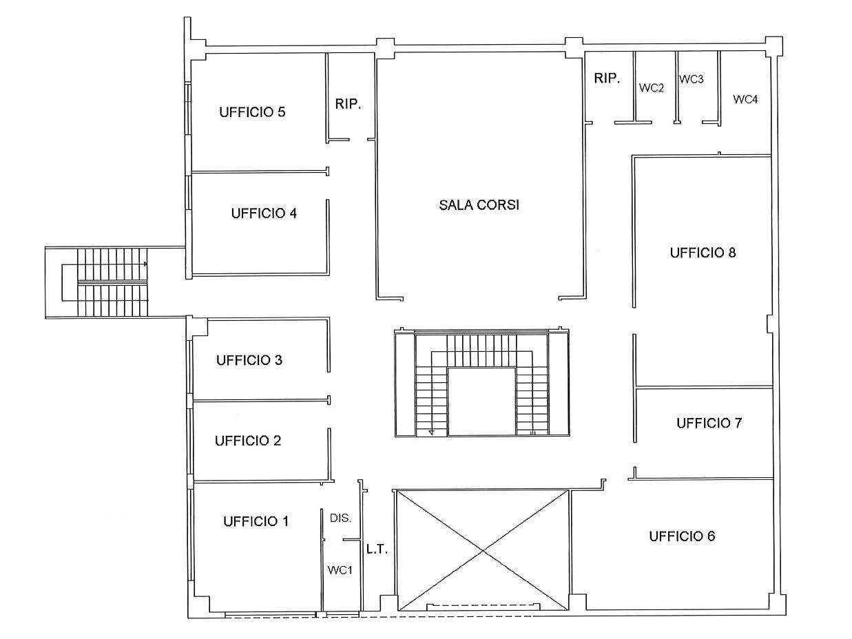 Il piano primo ospita la zona direzionale composta da 8 uffici tutti finestrati, una spaziosa sala corsi perfetta per attivit formative o riunioni aziendali, oltre a ulteriori servizi igienici.