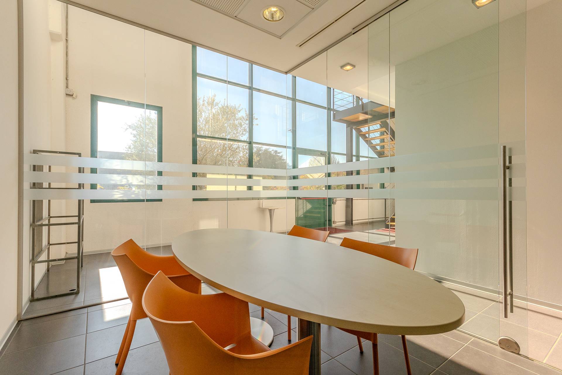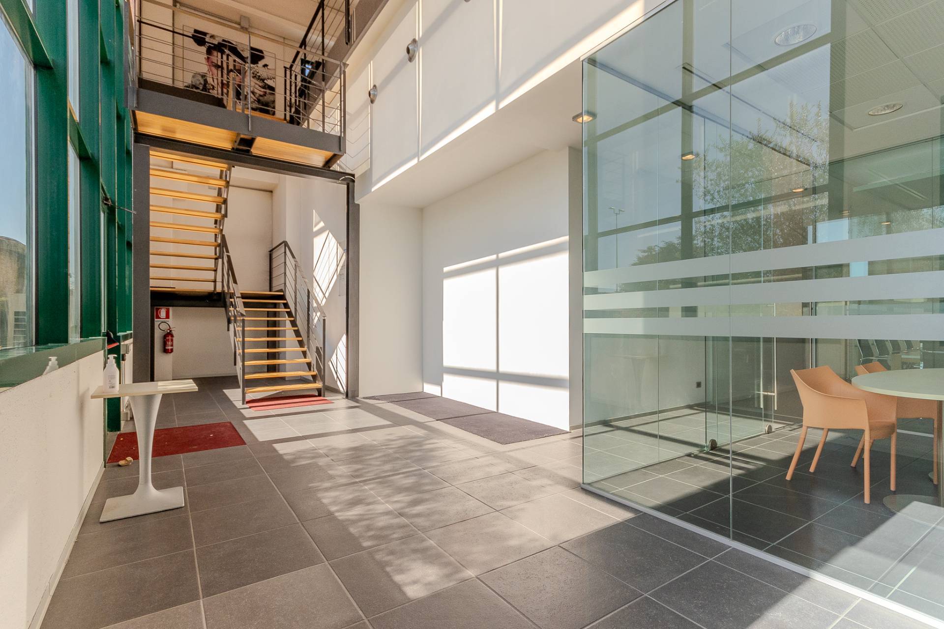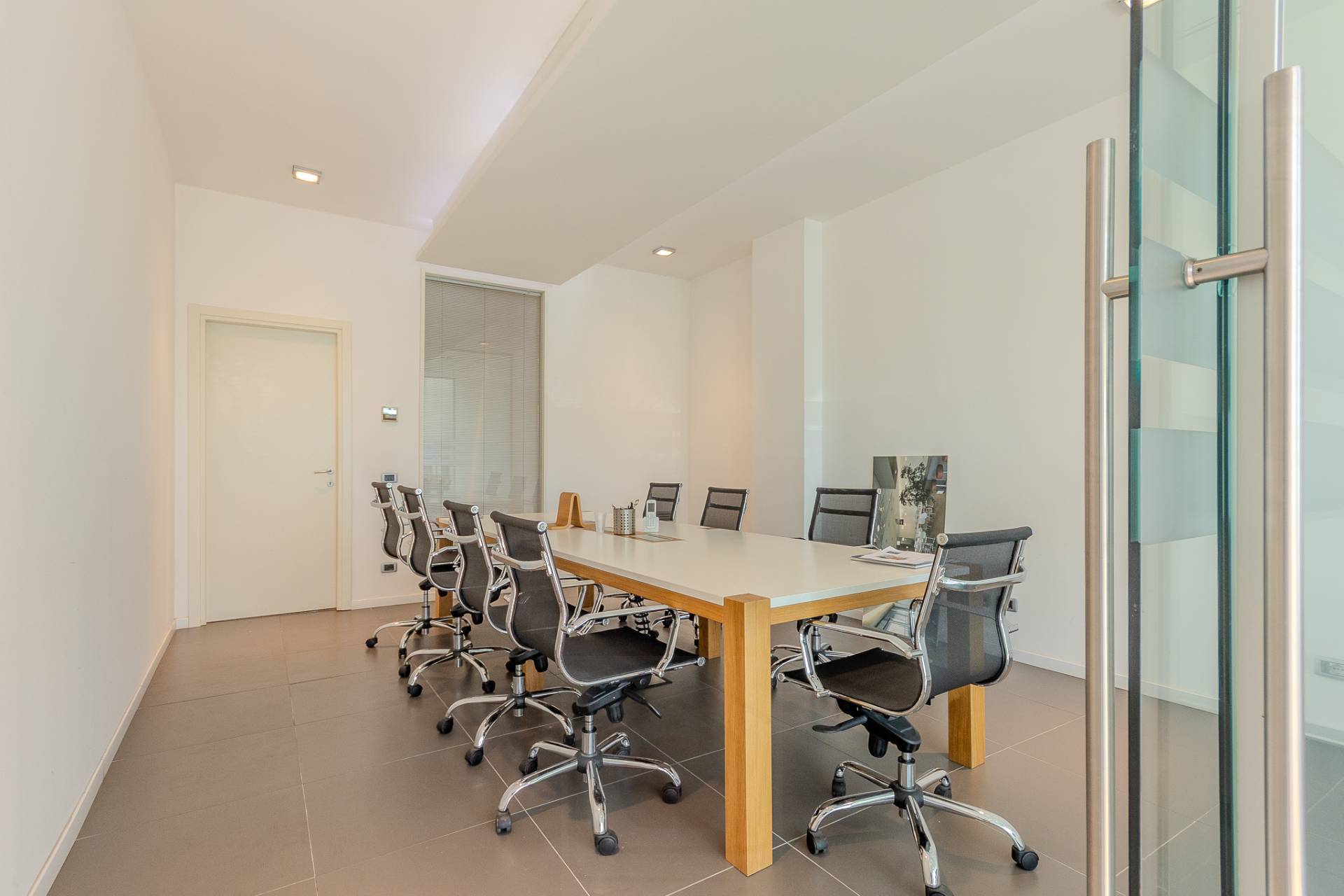 Sulla sinistra abbiamo l'accesso alla luminosa scala aperta che porta al piano superiore e sulla destra abbiamo due eleganti sale riunioni divise da vetrate e un comodo archivio.