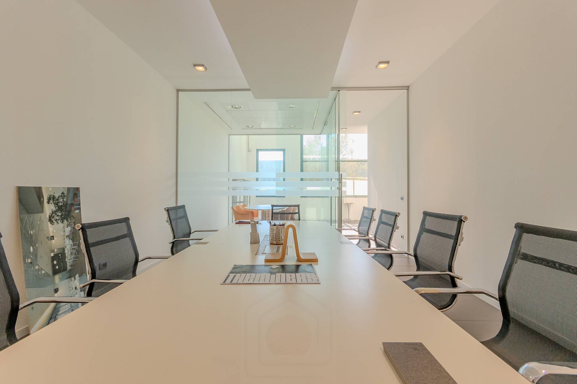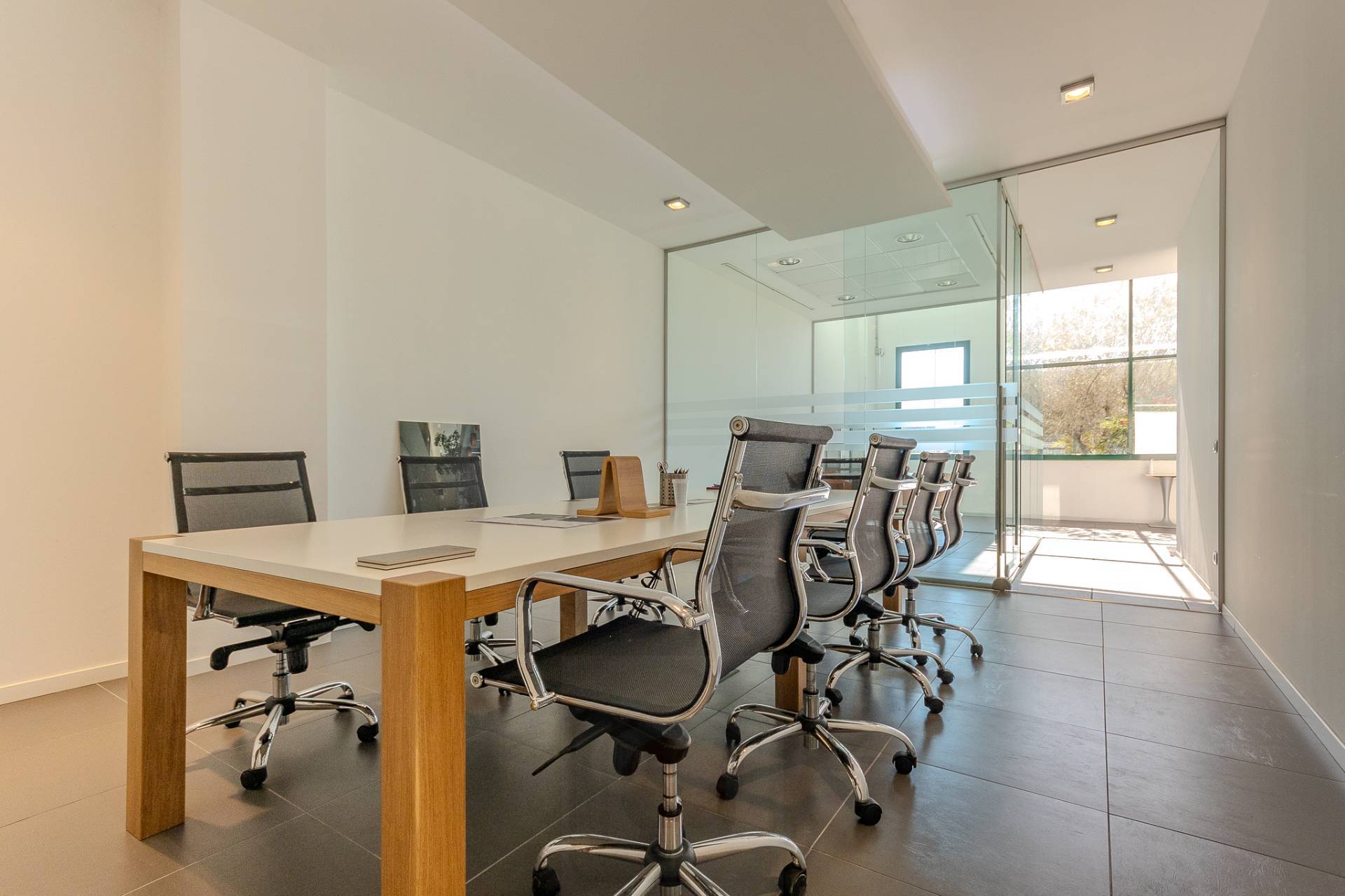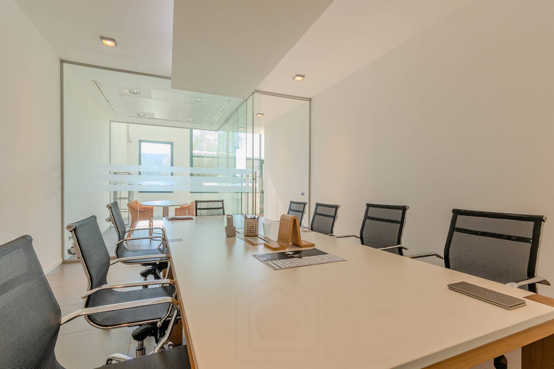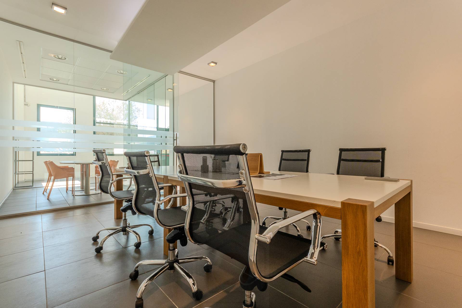 Sulla sinistra abbiamo l'accesso alla luminosa scala aperta che porta al piano superiore e sulla destra abbiamo due eleganti sale riunioni divise da vetrate e un comodo archivio.