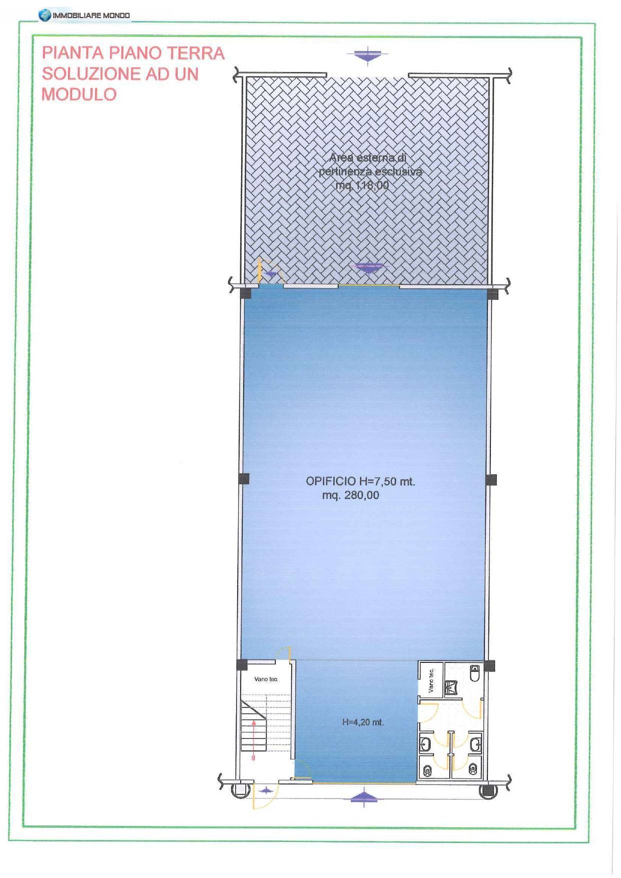 Il capannone ideale, per: industria, artigianato, magazzino, deposito, ecc. Limmobile di 280,00 mq. di superficie coperta priva di barriere architettoniche, per agevolare le operazioni di carico e scarico.
