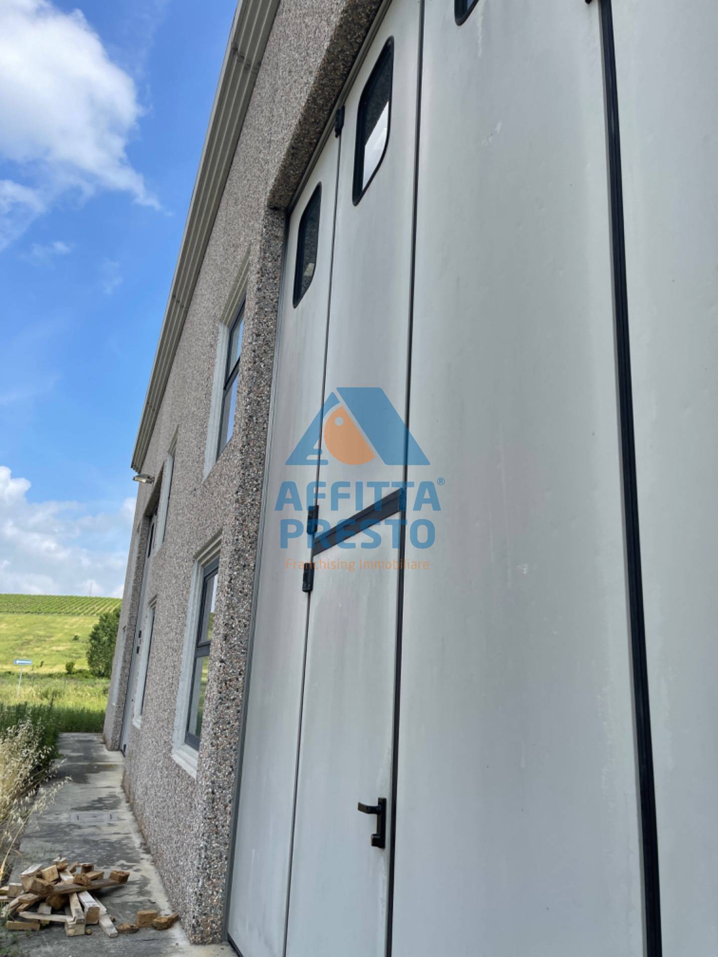 Libero su 4 lati, due portoni ampi per scarico e carico ed altri due sul retro.