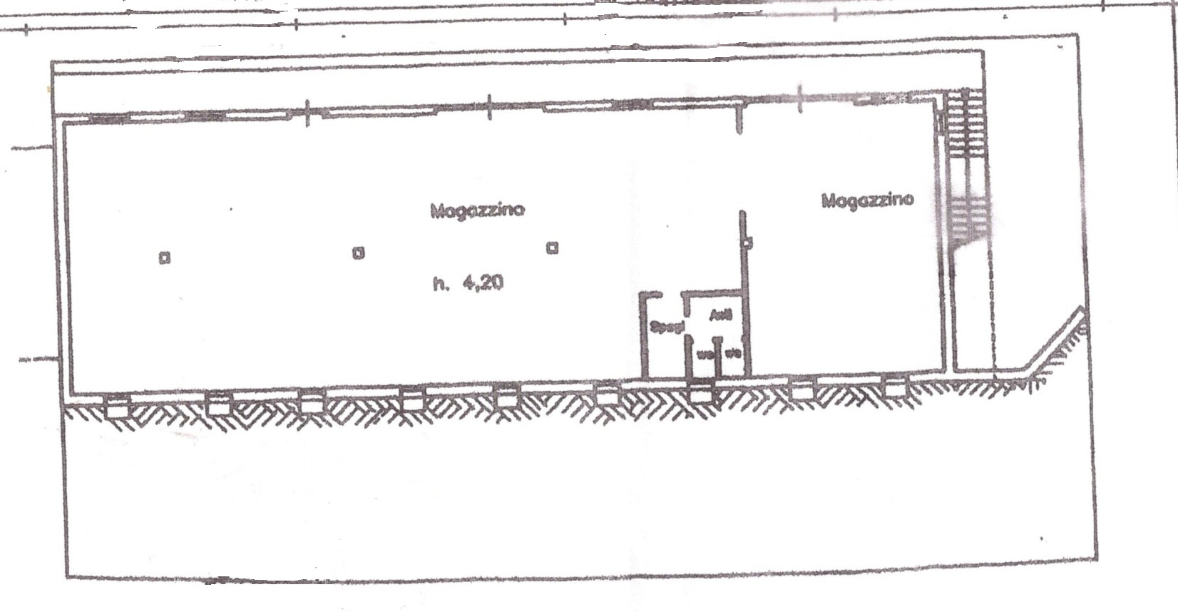 Il capannone composto da un ampio spazio per lo svolgimento dell'attivit con altezza interna utile di 4,30 metri, servito da due entrate carrabili, ha un ufficio, un magazzino e un doppio bagno con spogliatoio.