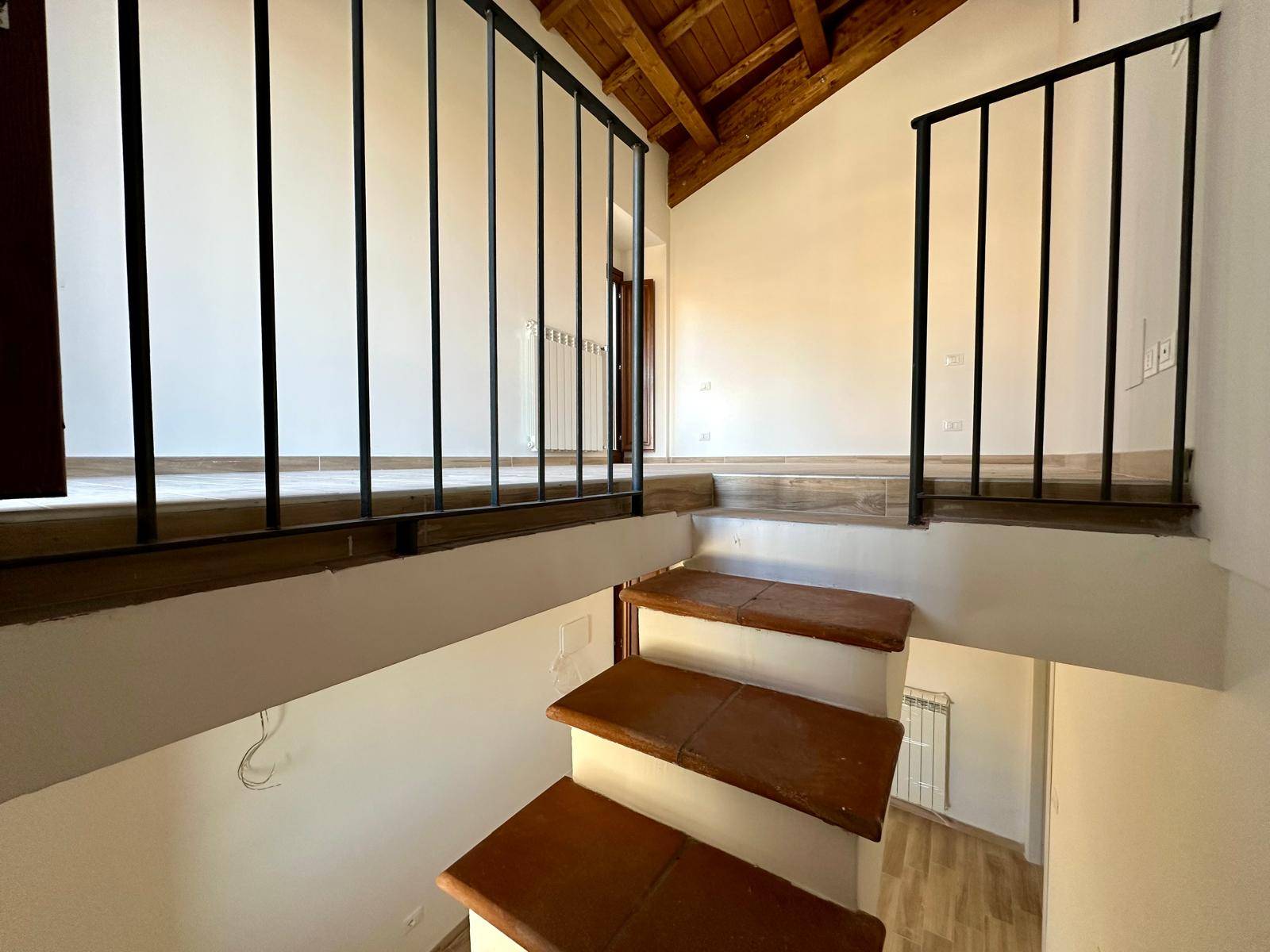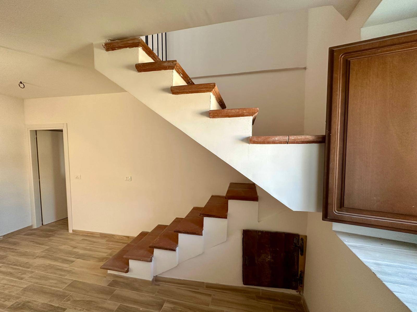 Una scala a vista in cotto ci conduce al primo piano dove troviamo una camera matrimoniale open space con tetto a vista in legno servita da balcone, accessibile anche da una scala esterna.