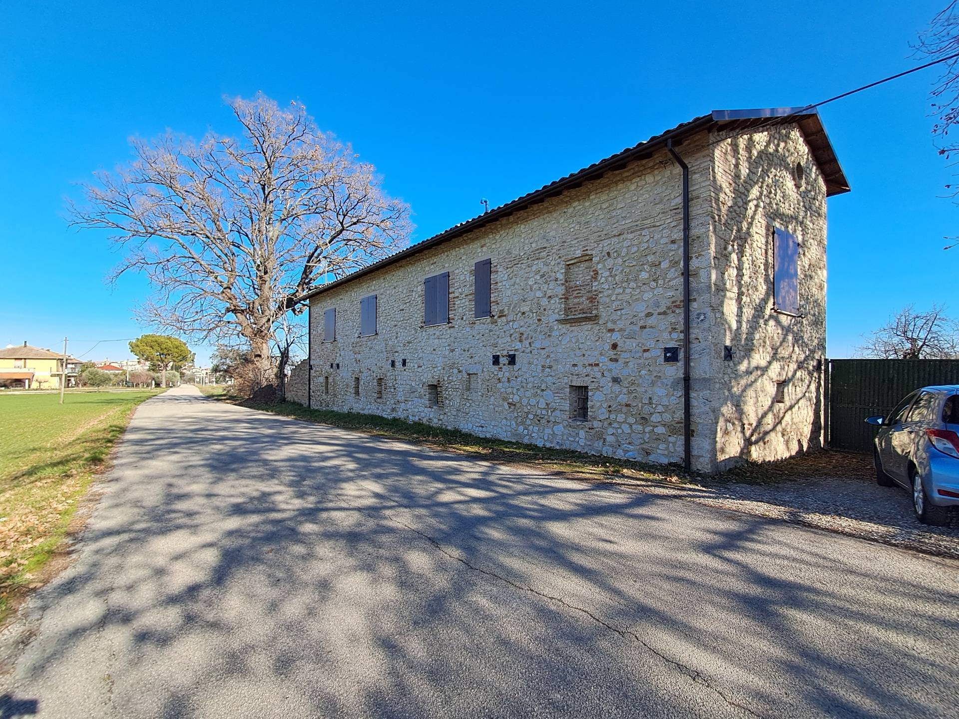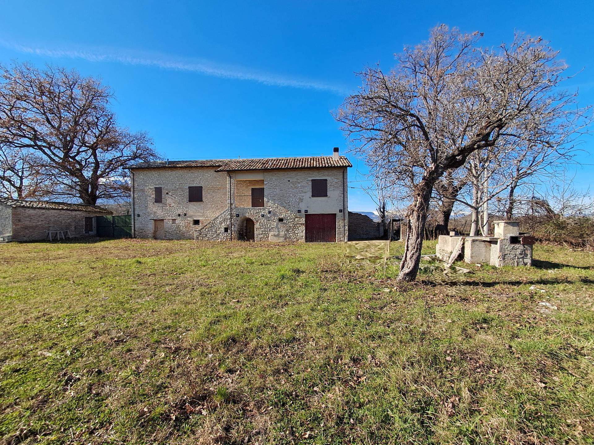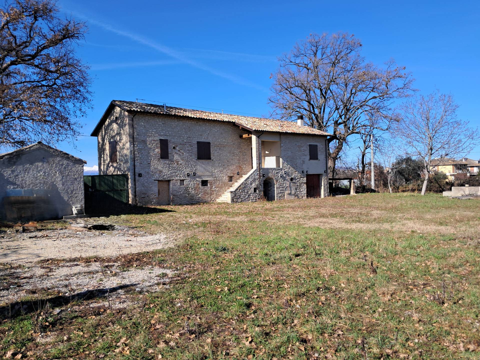 Trattasi di un'antica casa colonica marchigiana con scala esterna restaurata nella struttura con tutti i metodi antisismici, esternamente a pietra e mattoni come nella tradizione marchigiana, i solai del soffitto del piano terra sono in legno di castagno come pure quelli della copertura, le pareti interne sono coibentate con materiale isolante di 12 cm. Il piano primo di mq 150 circa completamente ristrutturato e realizzato con materiali nuovi, compresi gli impianti, composto da un ampio salone con angolo cottura, tre camere da letto, bagno con possibilit di realizzare il secondo.
