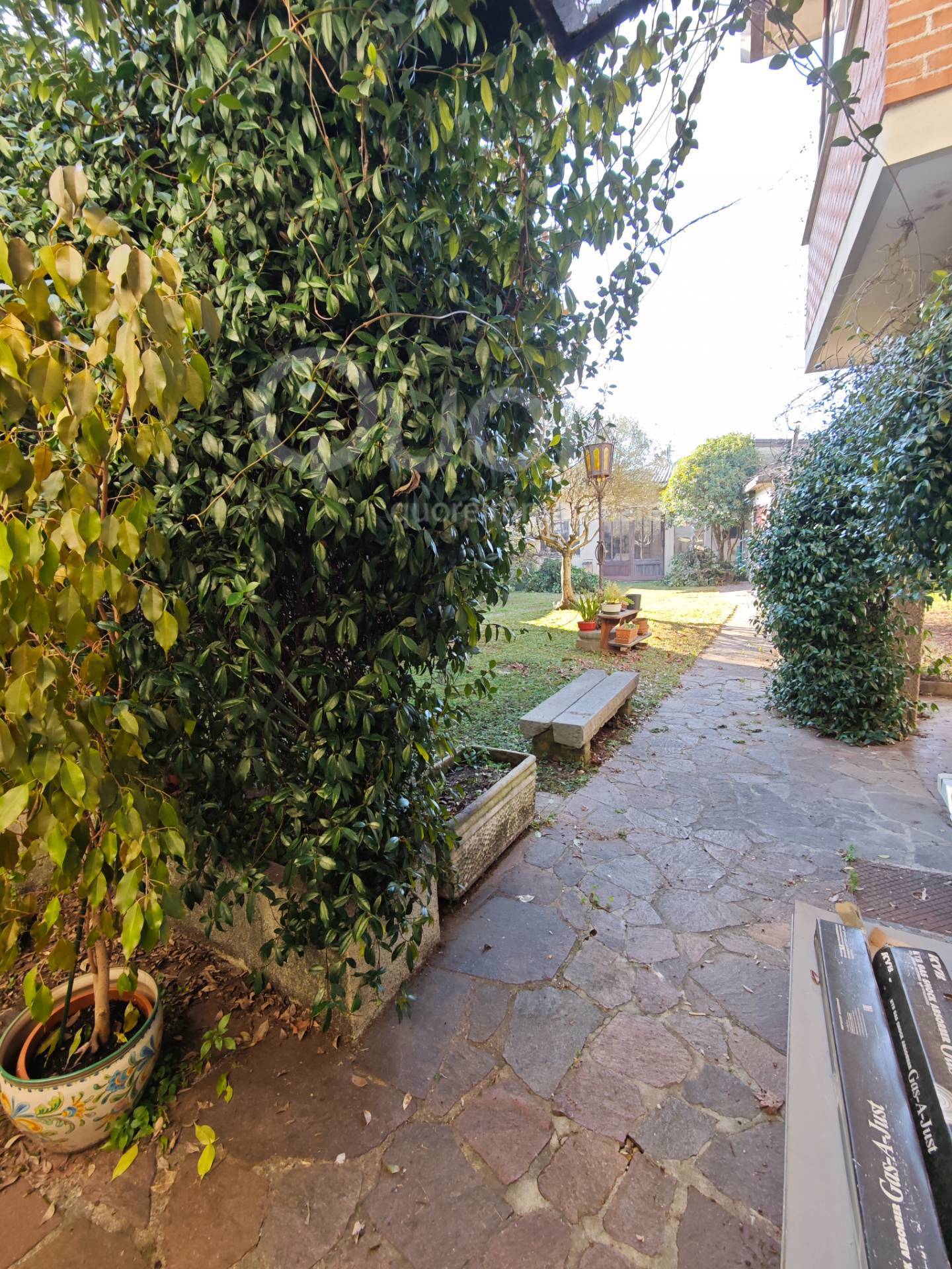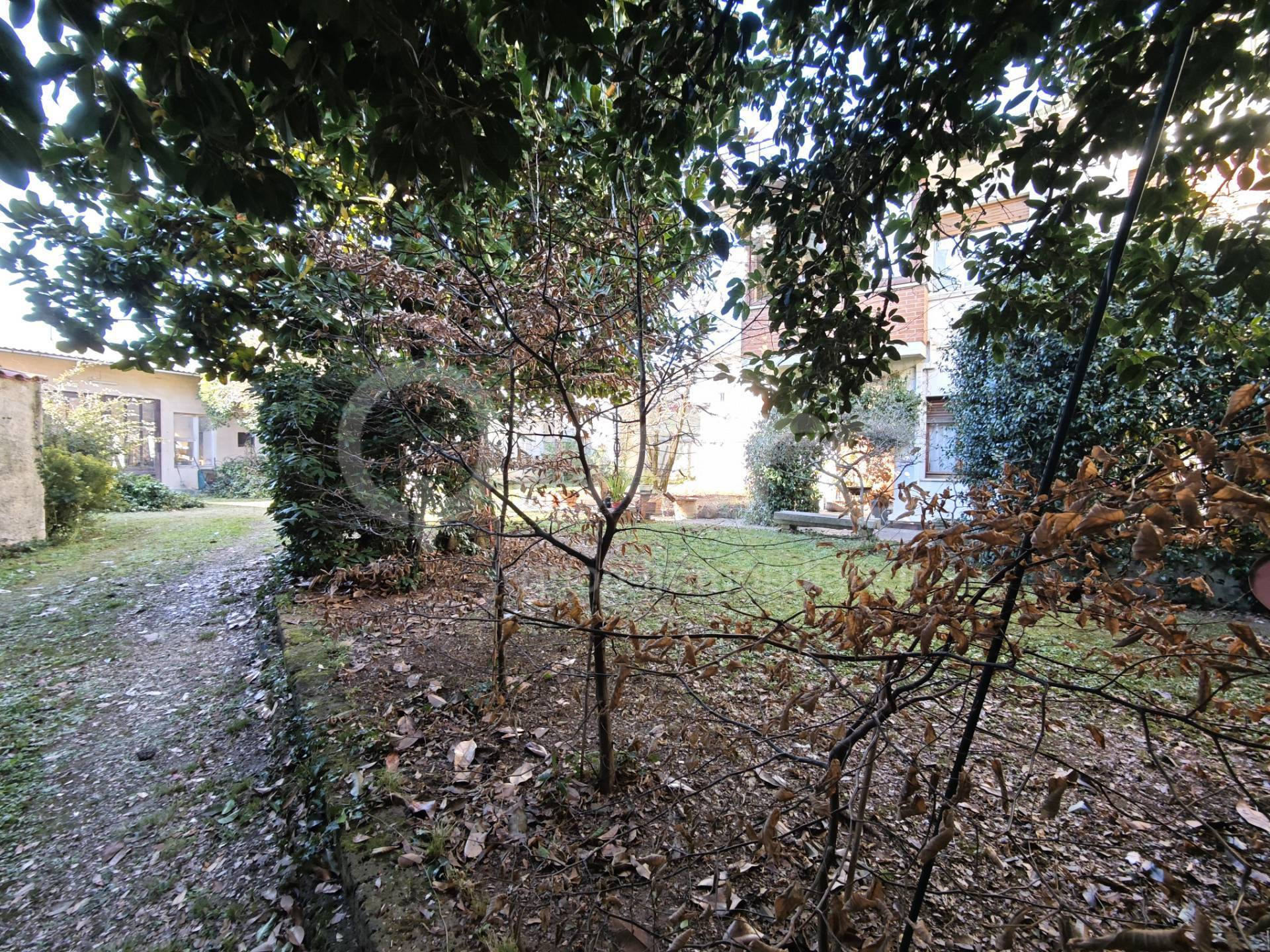In posizione centrale, casa in linea su tre piani con giardino interno di 360 mq e due ampie pertinenze uso deposito/autorimessa e stanza conviviale.