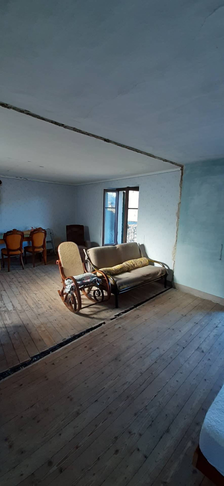 Secondo Piano: Questo piano gi ristrutturato ed abitabile e si compone di un soggiorno con cucina a vista e balcone, un disimpegno, due camere da letto ed un bagno.