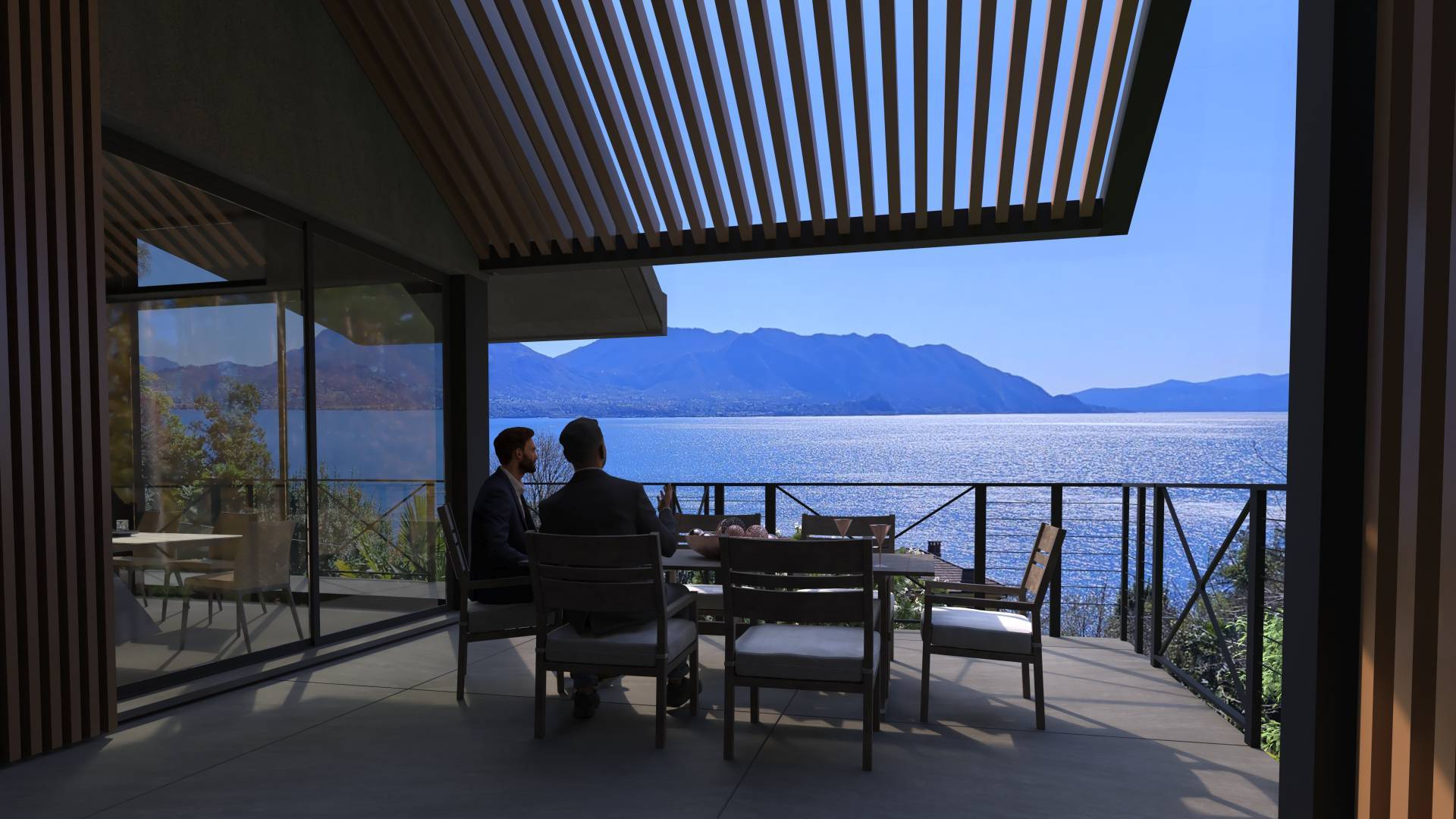 Al piano superiore si trova un open space, di oltre mq. 52, dedicato completamente alla zona giorno, completamente circondatao su tre lati da un porticato coperto di circa 30 mq., una ulteriore terrazza scoperta di circa 40, ed un ampio balcone di circa 19 mq. Al piano inferiore troviamo due camere da letto, con ampie finestre vista lago, entrambe con accesso diretto alle terrazze ed al giardino.