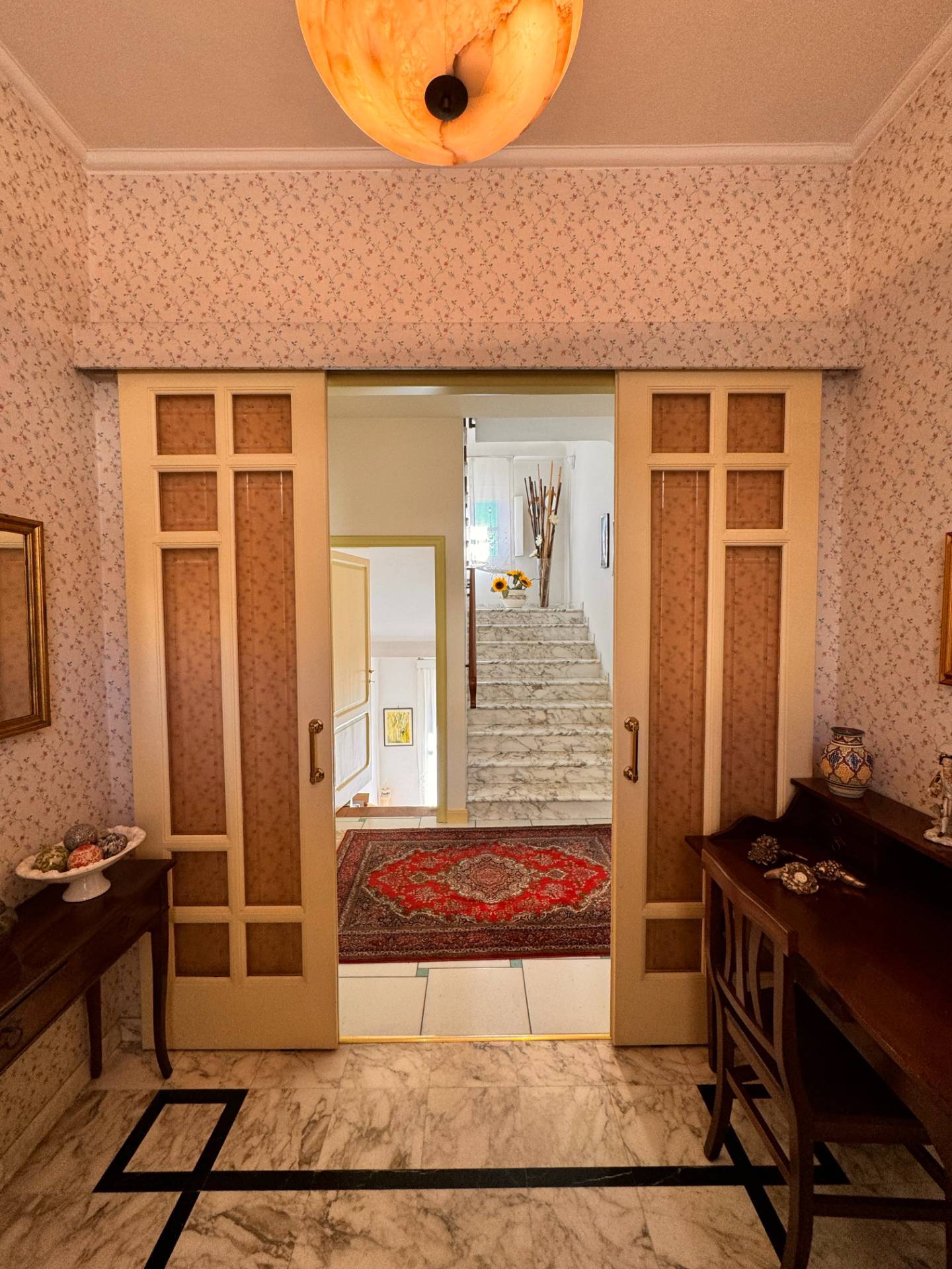 Percorrendo la scala in marmo possiamo accedere al piano primo dell'abitazione dove abbiamo un reparto notte completamente pavimentato in parquet, con un un bellissimo pianerottolo, luminoso e con balcone.