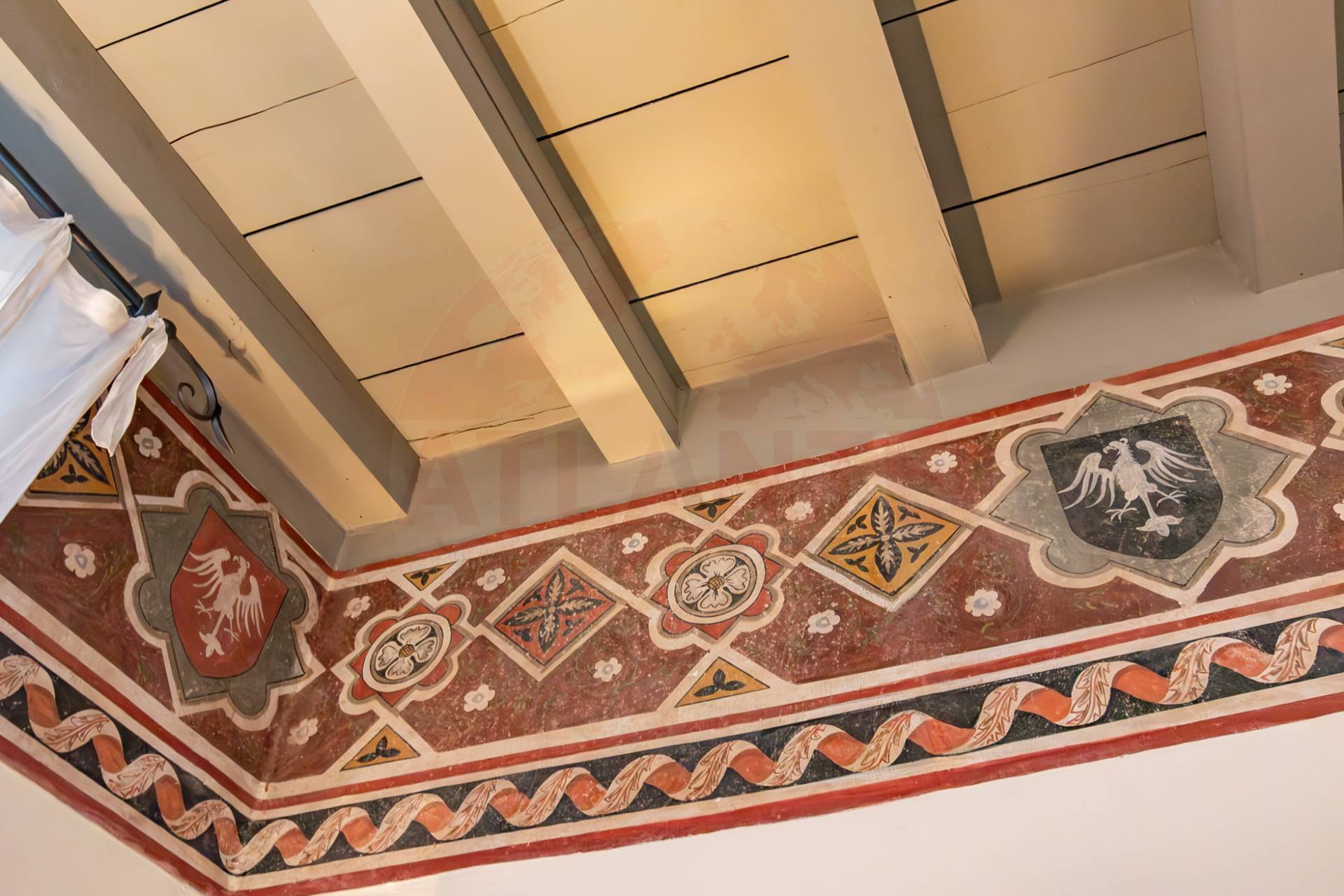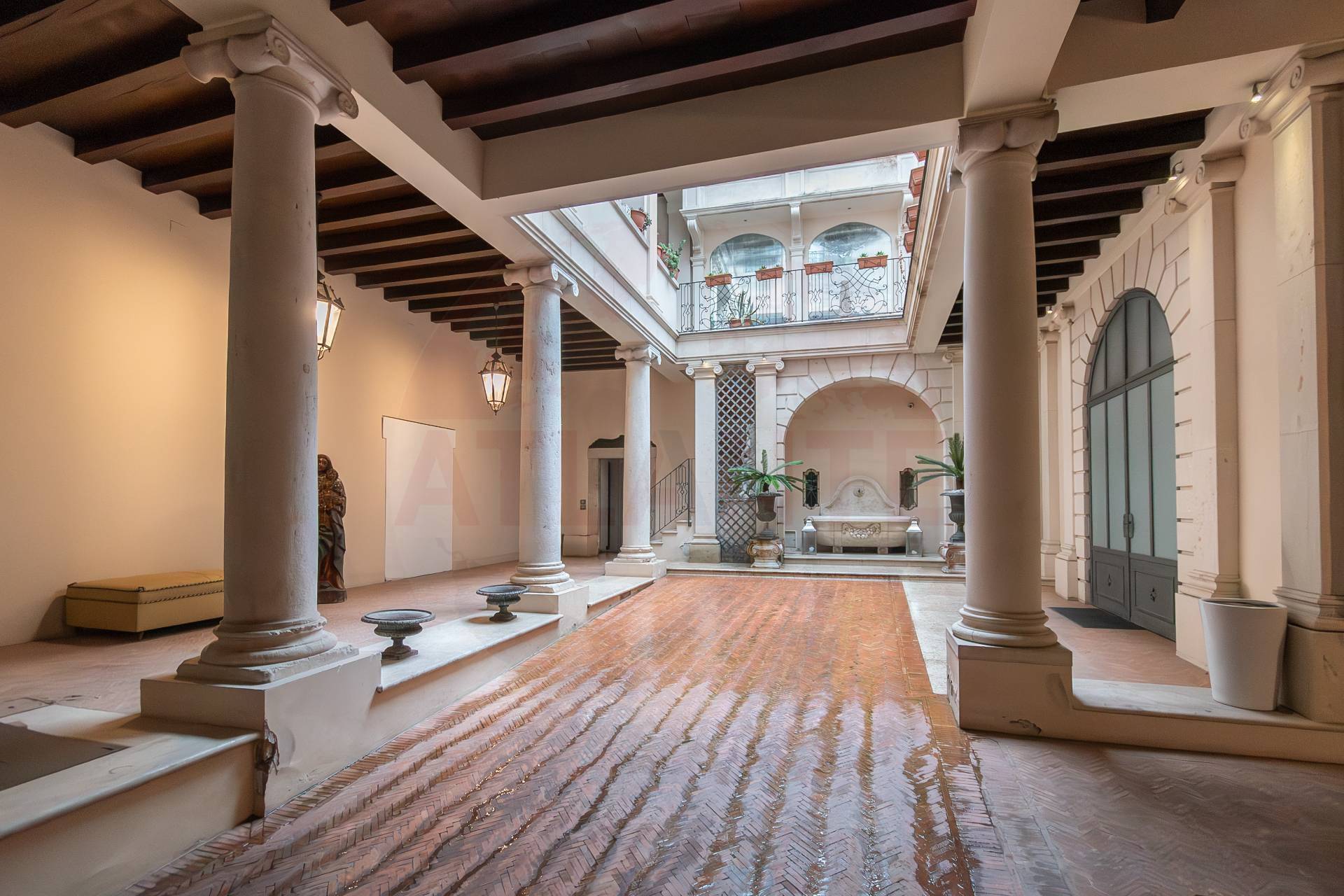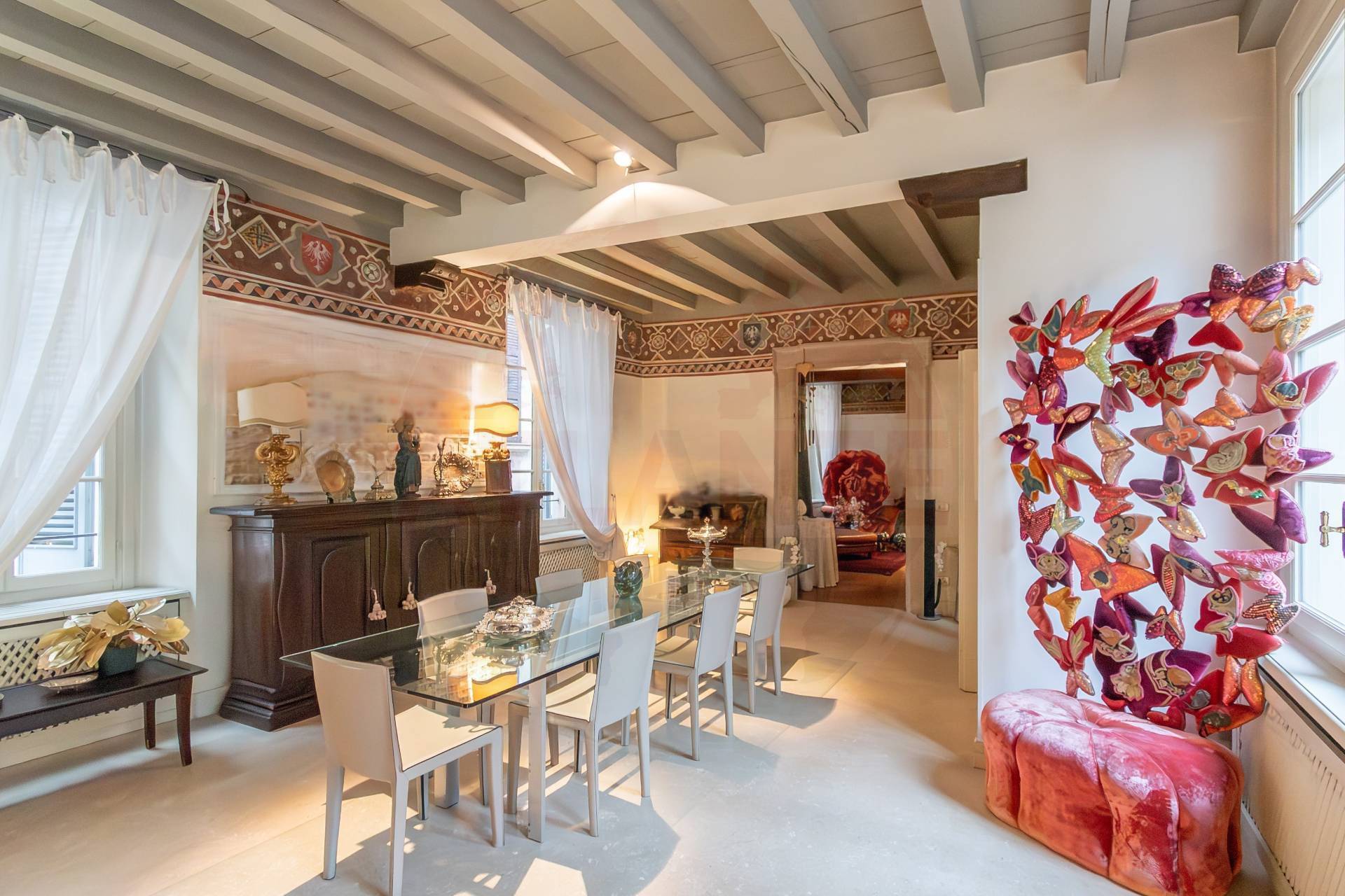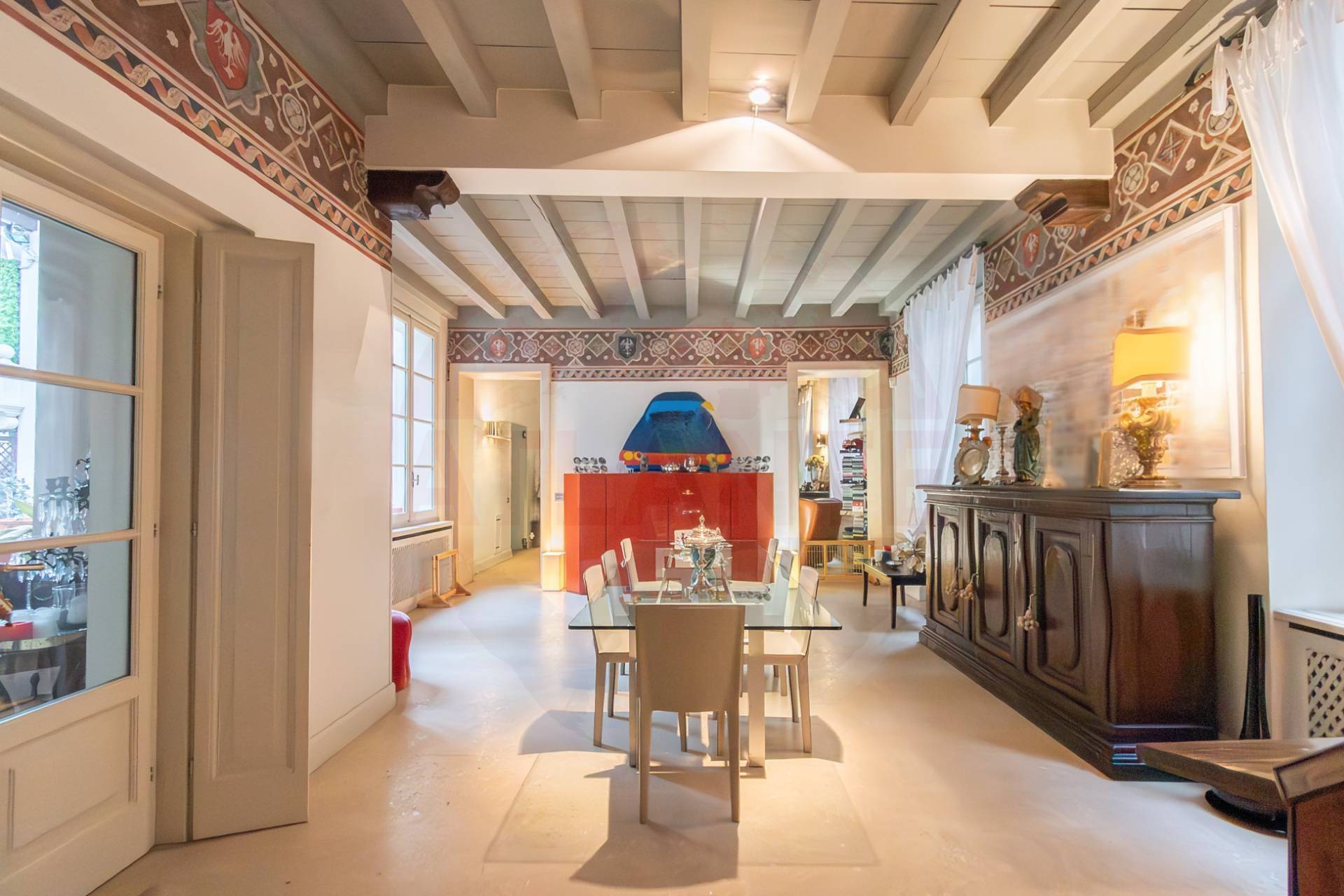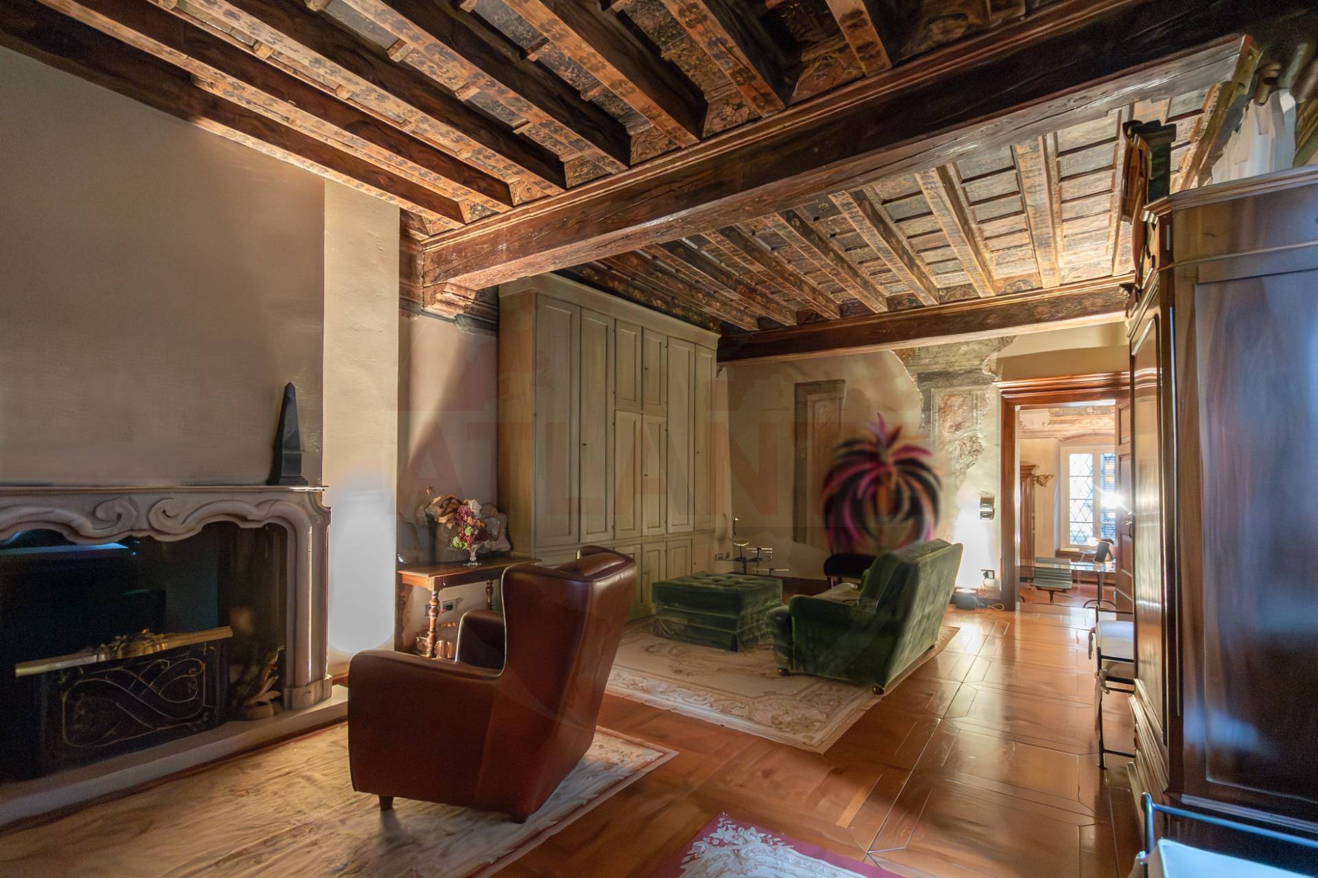 Il primo piano, raggiungibile tramite scala in marmo o ascensore, offre ampi spazi per convivialit e relax, tra cui un salone di accoglienza con soffitto a travi a vista sbiancate, una cucina/sala da pranzo suddivisa in due aree, tre saloni pavimentati in pregiato parquet pali di Venezia a motivo geometrico e impreziositi da affreschi originali riconducibili al 1500/1600; imponenti camini in marmo e soffitti a cassettoni decorati dal tocco barocco, oltre a una sala/studio anchessa impreziosita da raffinati affreschi e soffitto a cassettoni.