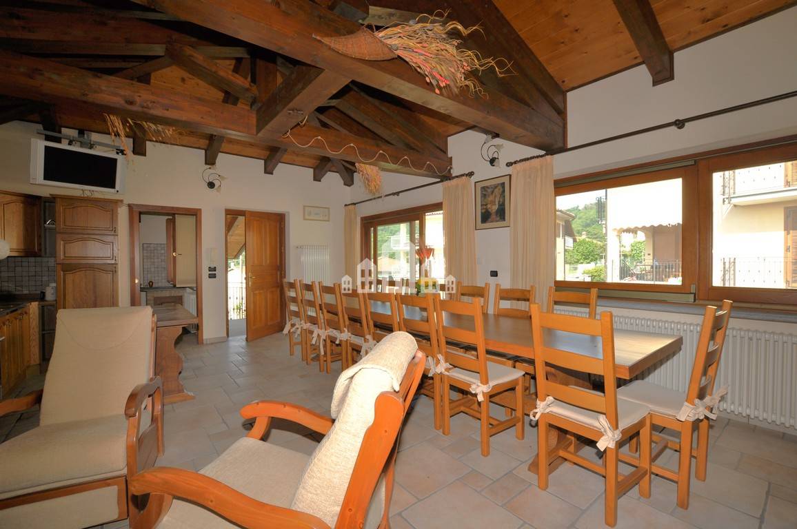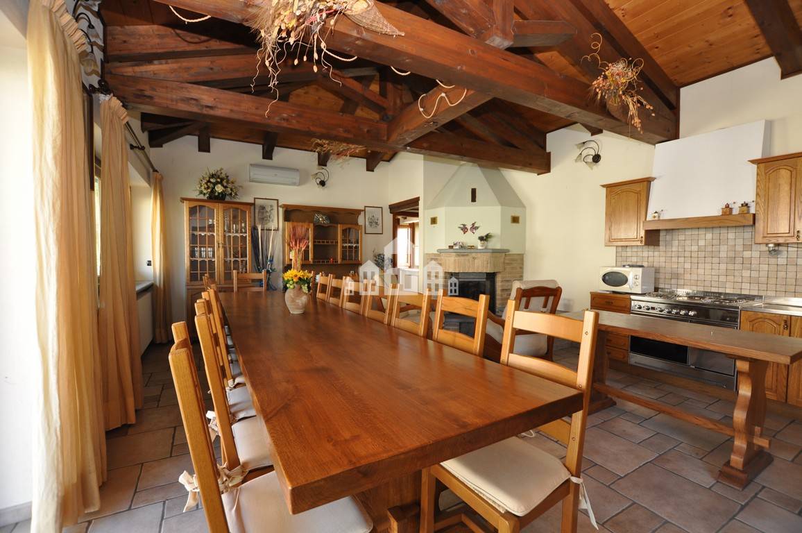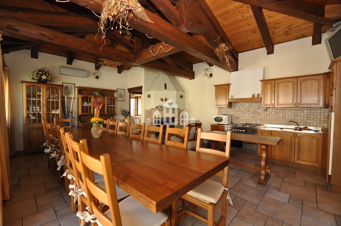 Il piano primo dedicato alla zona abitativa principale, dove troviamo un ampio soggiorno con cucina a vista, arricchito da particolari travi in legno a vista e da un caratteristico camino che rende lambiente caldo e accogliente.