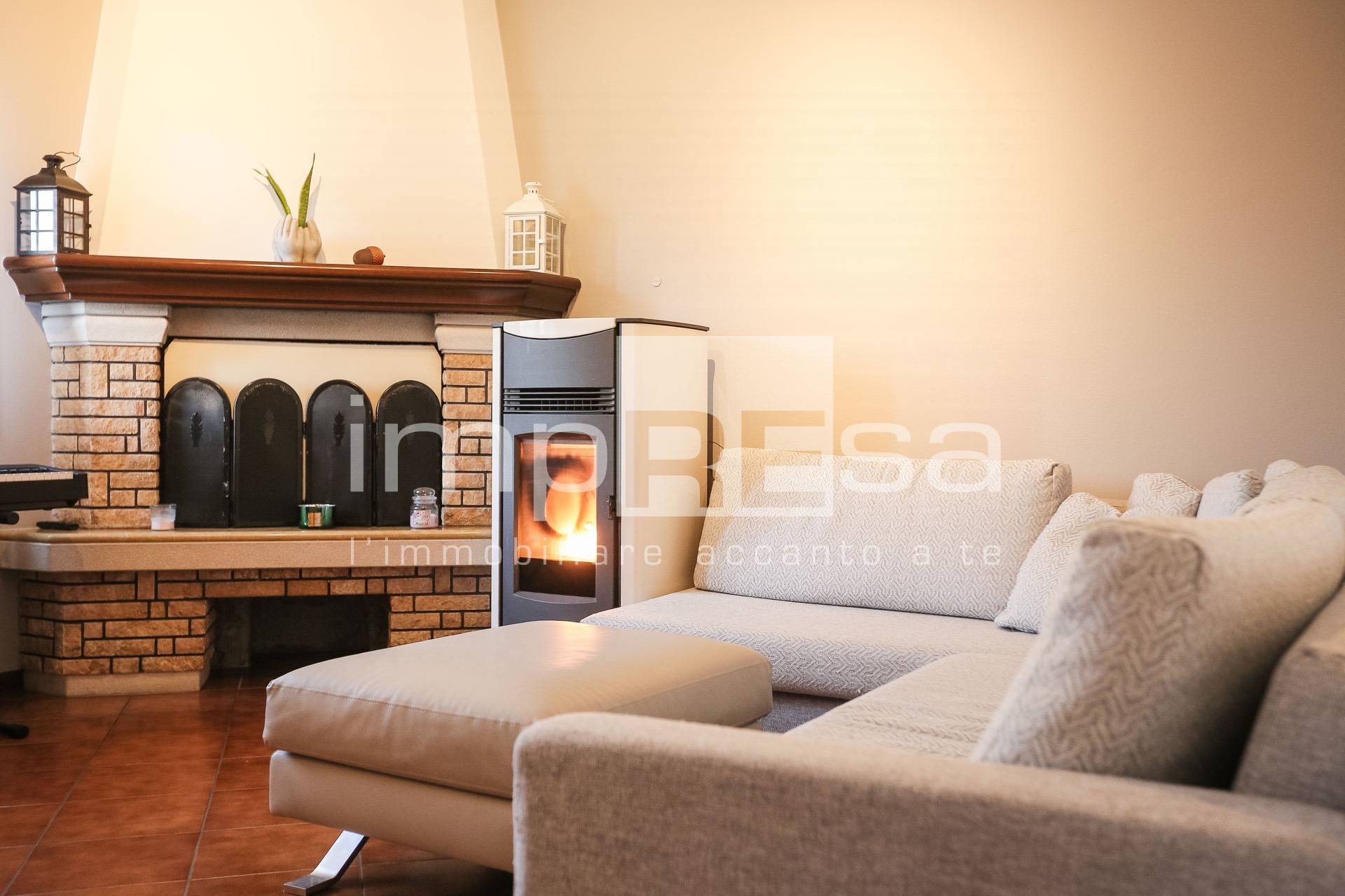 Lingresso accogliente conduce alla luminosa zona giorno, cuore della casa: qui il soggiorno, impreziosito da caminetto e stufa a pellet, crea unatmosfera calda e rilassante, perfetta per momenti indimenticabili in famiglia o con gli amici.