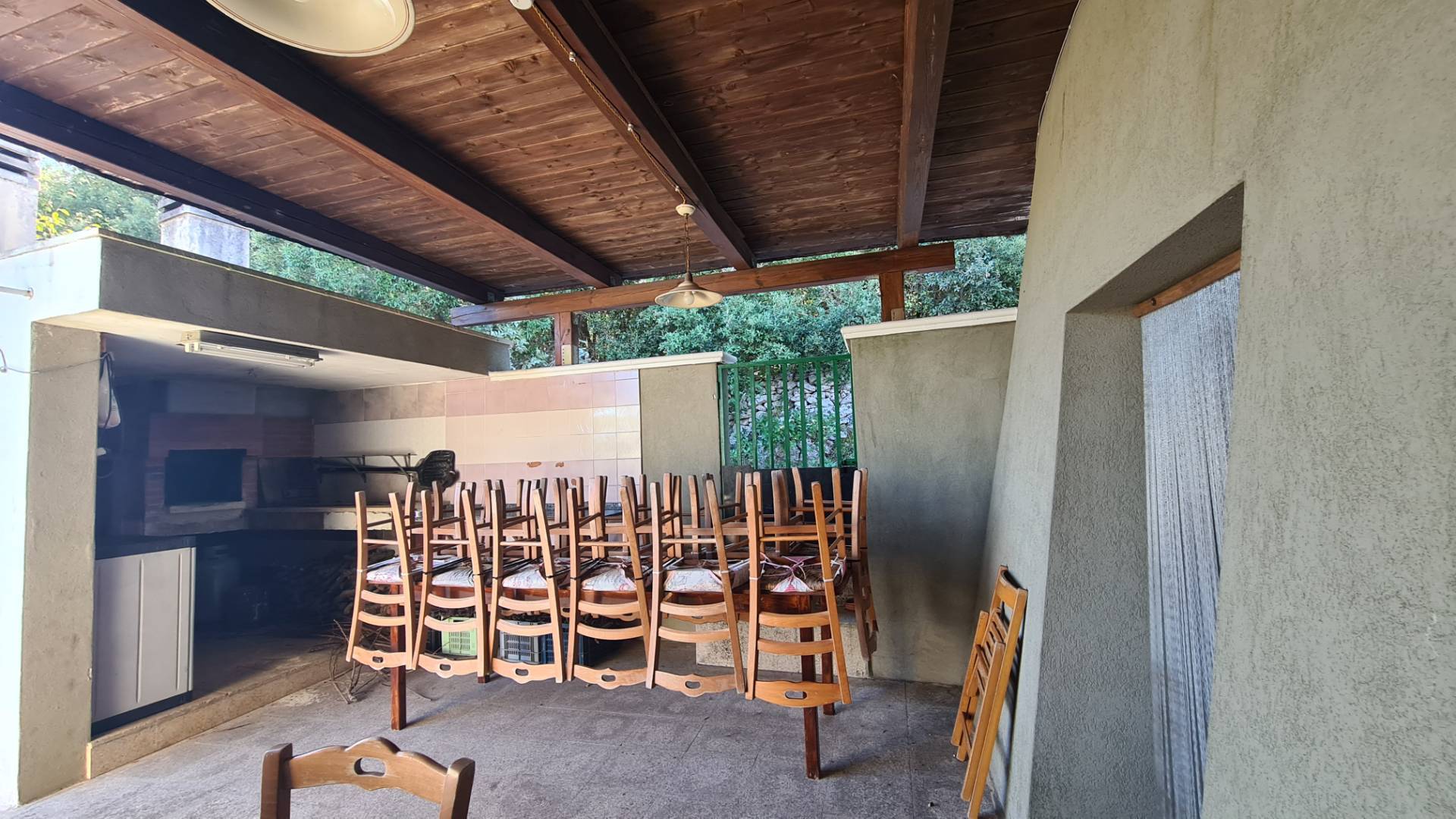 Inoltre vi una zona chiusa da una veranda in legno completa di forno e barbecue.