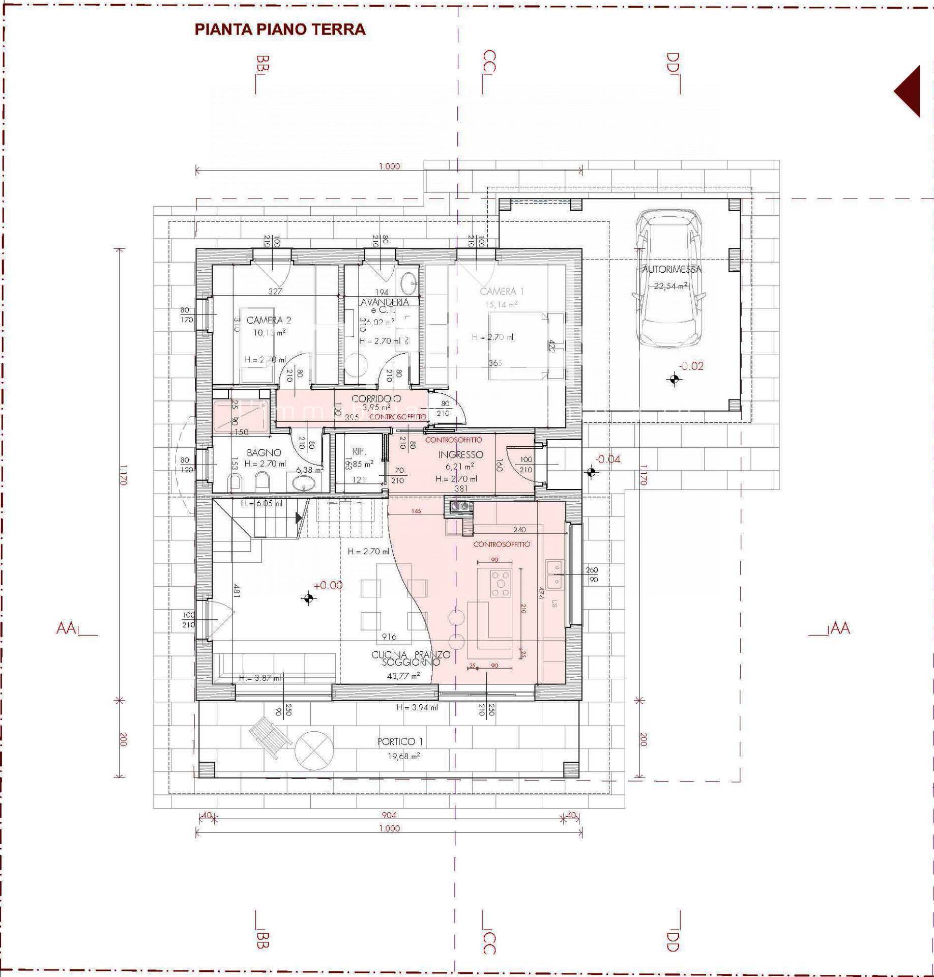 La soluzione proposta prevede al piano terra zona giorno open-space di quasi 45 mq, due camere, due bagni, lavanderia e rispostiglio, al piano primo terza camera, terzo bagno ed ampio soppalco.